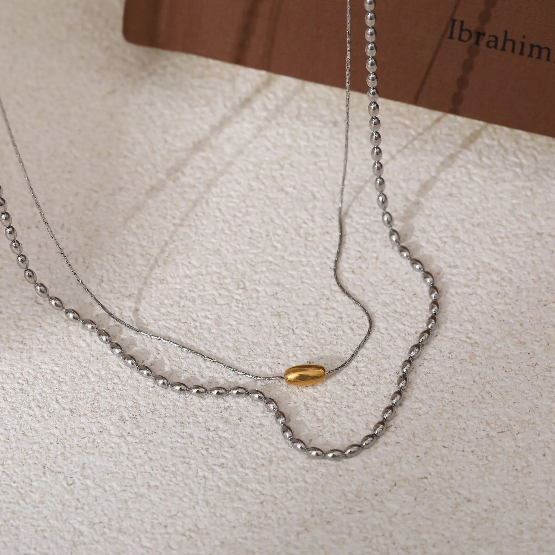 The Titanium Steel Gold Rice Grain Double-layer Contrast Color Necklace is a sophisticated and versatile accessory
