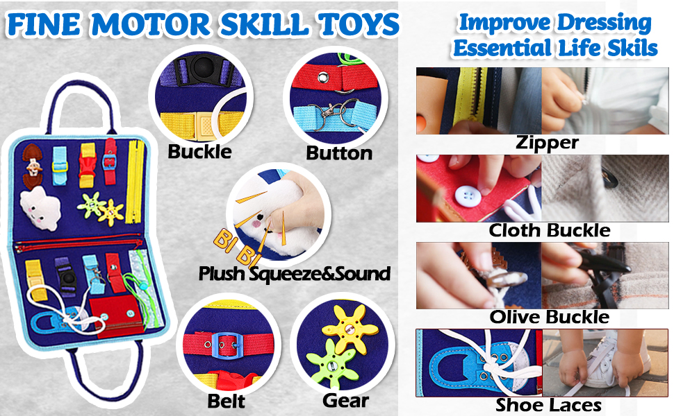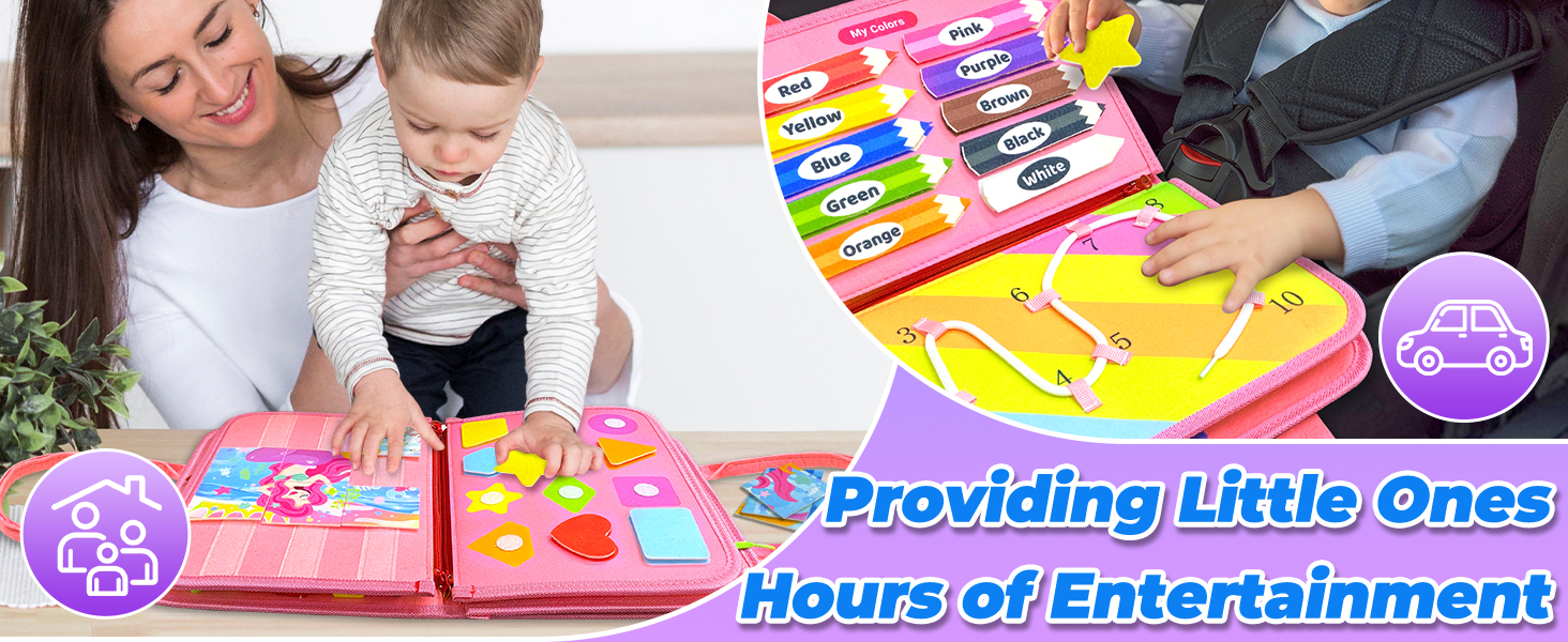 - Endless Fun Learning Toy: This busy book for toddlers is based on Montessori education theory to design, helping children to develop a lot of skills, including basic life skills, fine motor skills, hand-eye coordination, thinking ability and problem solving ability, etc. Your little loved ones will have countless entertainment while playing this colorful activity board!