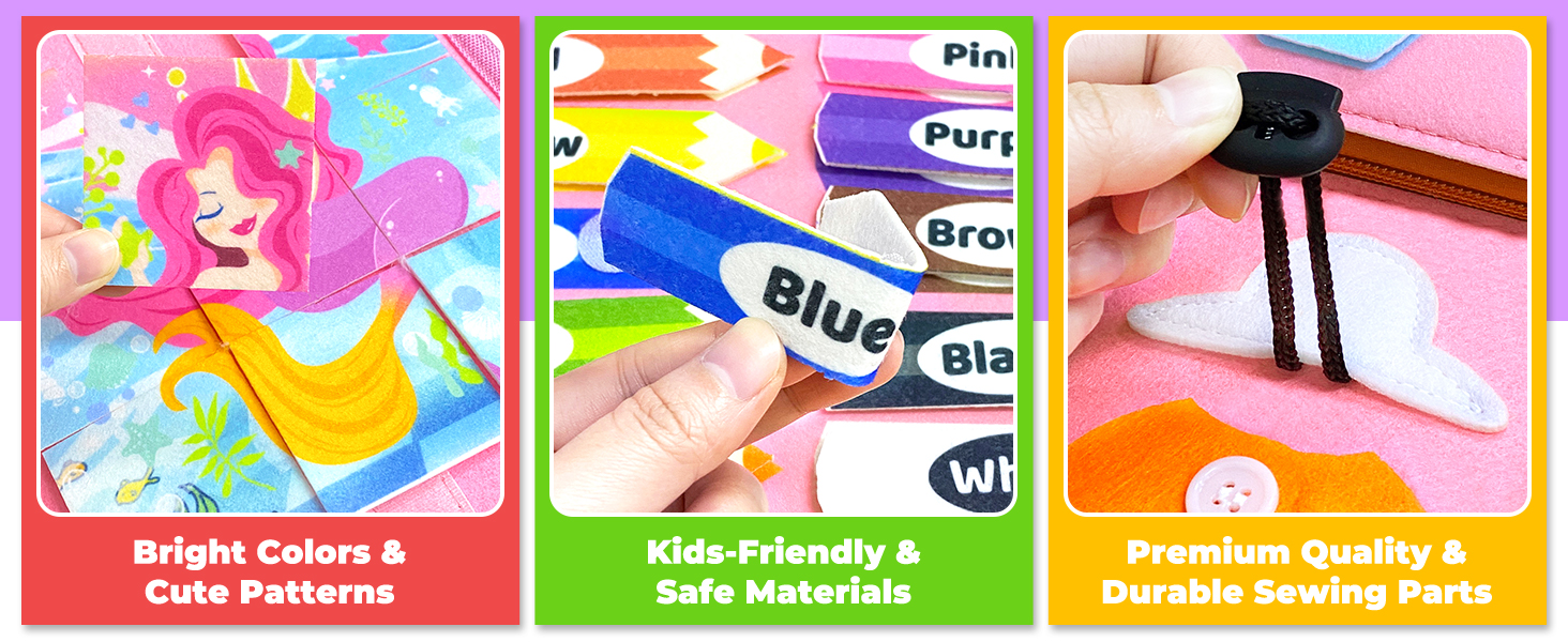 - Safe Sensory Board: Our toddler busy board is made of kids-friendly and soft felt material with smooth edges. All sewing parts in this busy book are reinforced and not easy to fall off, keeping your children busy and safe.