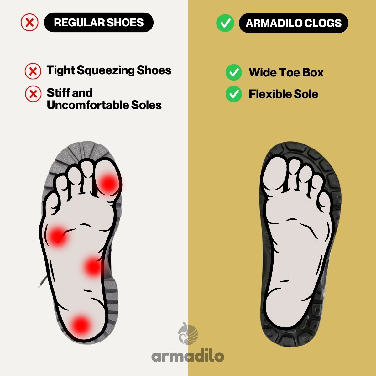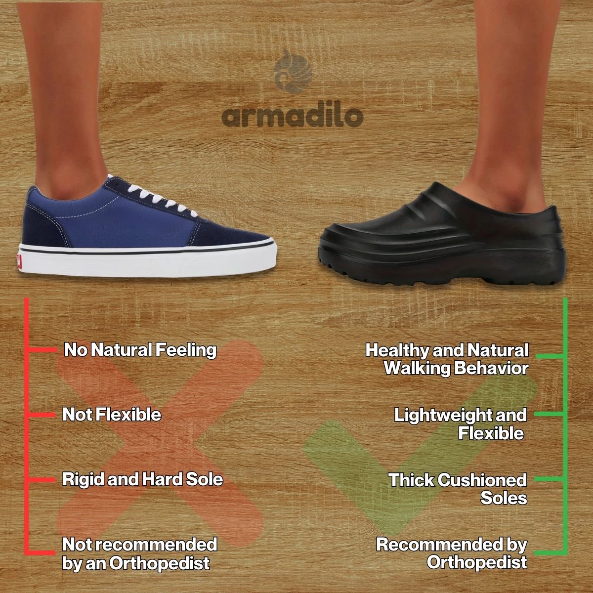 Our Armadilo Footwear clogs are thoughtfully designed for everyday wear, work, and outdoor activities, delivering exceptional comfort and support. Endorsed by orthopedic and podiatry experts for their ergonomic construction, these clogs are ideal for enhancing foot health and alleviating pain. Step confidently, knowing you're well-supported for both your adventures and your foot health.