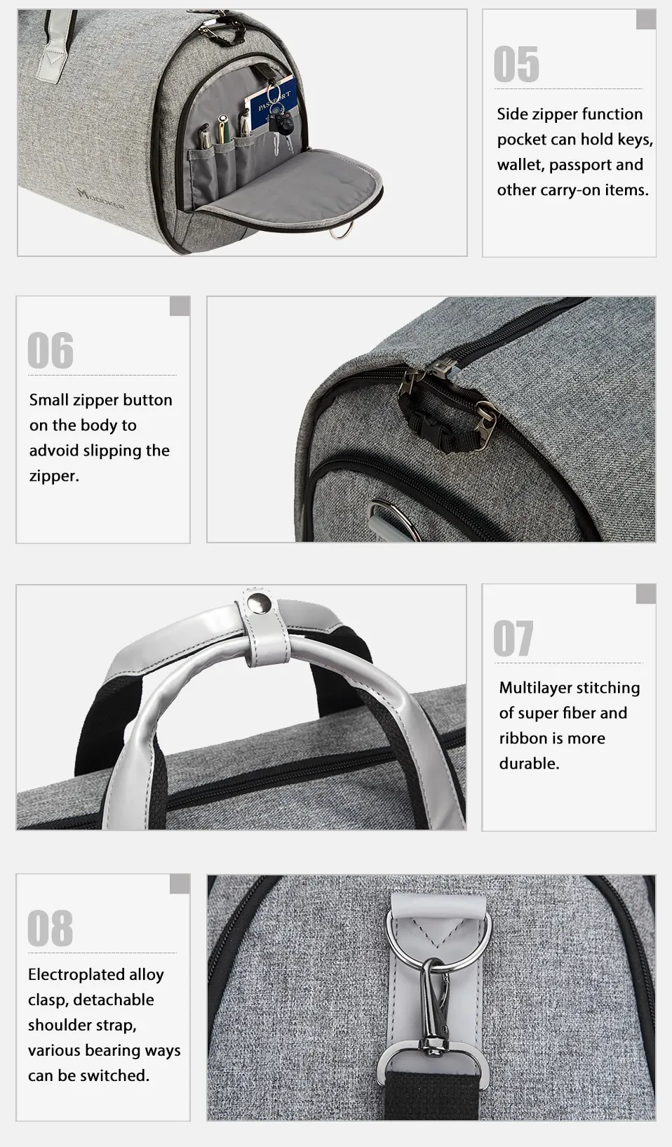 - Zippered Pockets: Multiple compartments for accessories, documents, and toiletries.