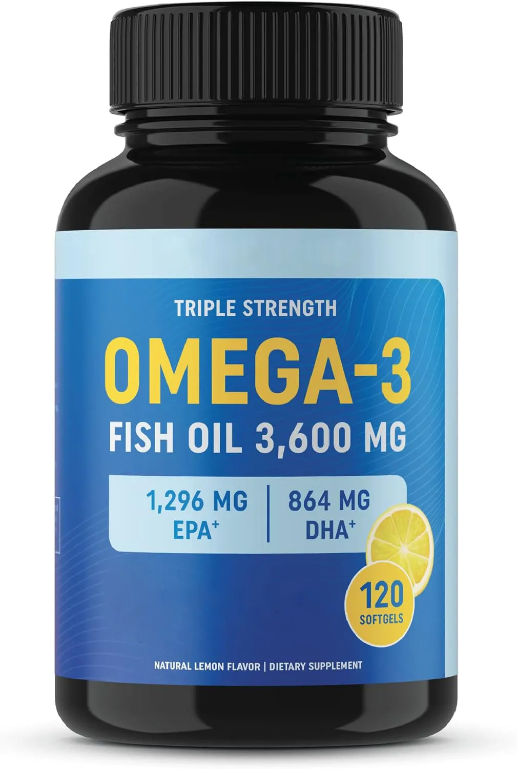 Triple Strength Omega-3 Fish Oil 3,600 mg with 1,296 mg EPA and 864 mg DHA per label. Natural lemon flavor dietary supplement with 120 softgels to support heart, brain, and daily wellness.