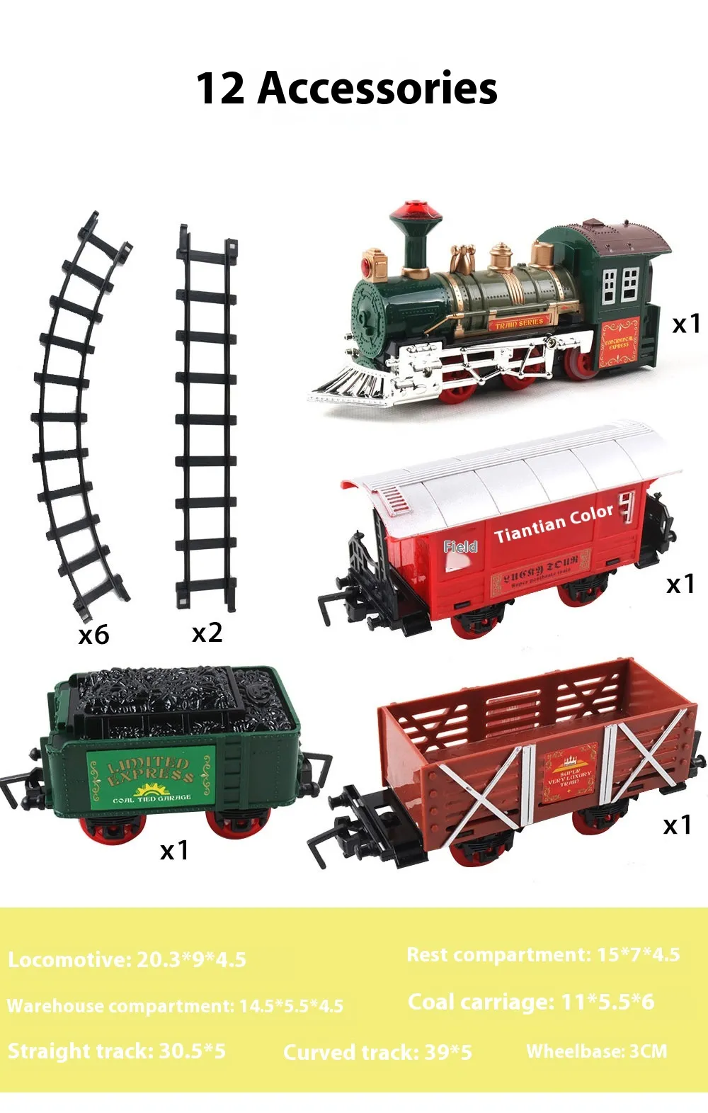 Locomotive X1, Rest Car X1, Warehouse Car X1, Coal Car X1, Straight Track X2, Curved Track X6 Product Image: