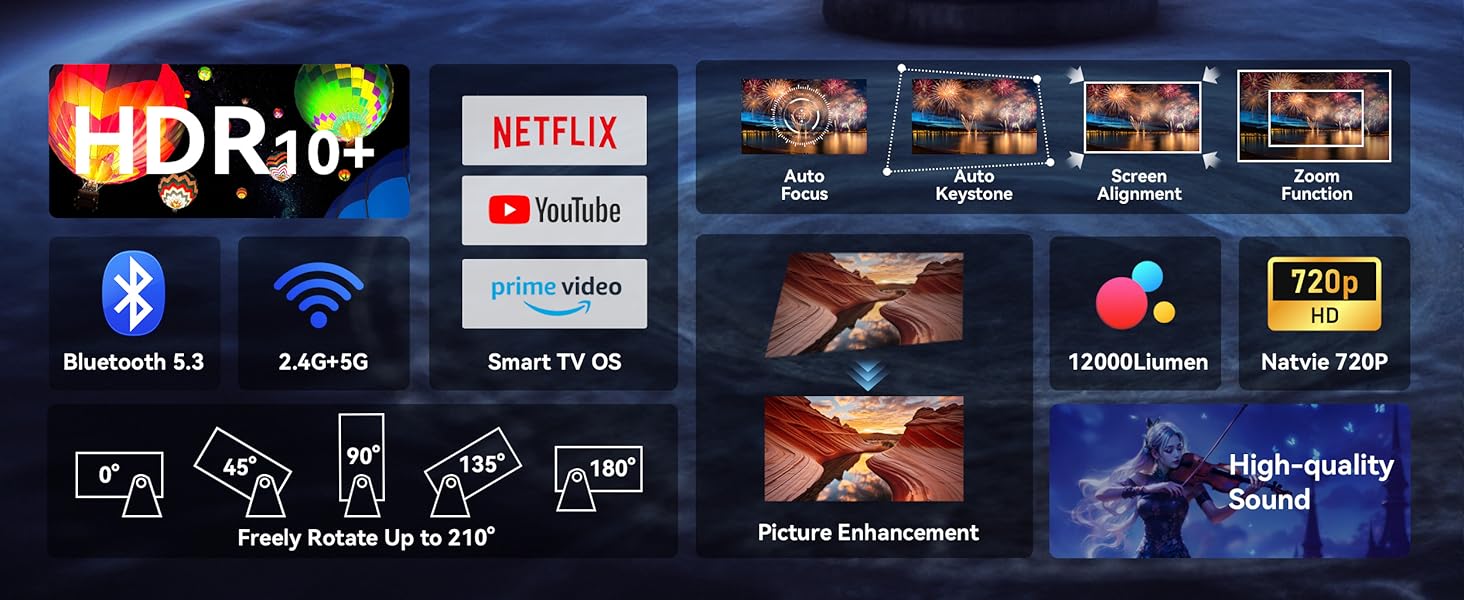 - 【Professional After-sales Service】If you have any questions, our 24-hour online after-sales service team provides you with peace of mind and reliable after-sales service. Package includes: smart projector, remote control (batteries not included), manual, power cord and HD cable. (For software update or software unavailable, please contact after-sales service)