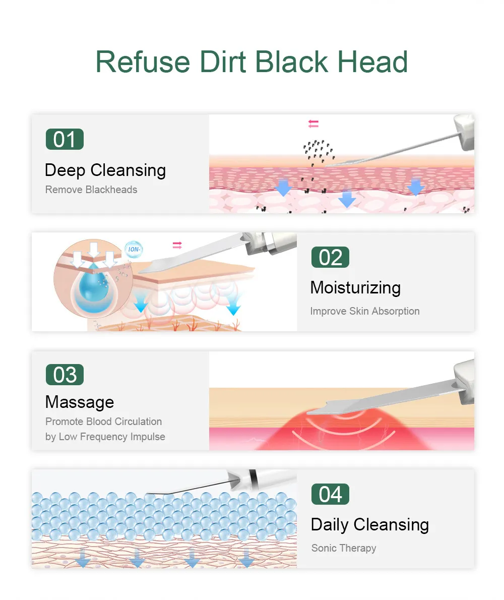 4. Reduces Blackheads and Acne By effectively clearing out clogged pores, this device helps to reduce the occurrence of blackheads and acne. The ultrasonic waves help to dislodge impurities without the need for harsh chemicals or abrasive scrubs, making it a safe and effective option for all skin types.