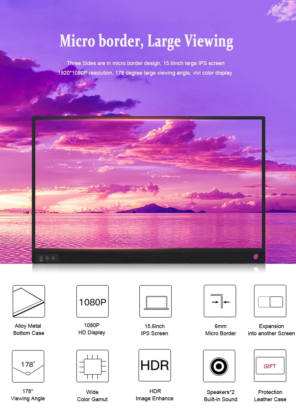 The Ultrathin 15.6-Inch Narrow Border Screen offers a sleek, space-saving design with a stunning 1080p IPS display, providing crystal-clear visuals and vibrant colors. Perfect for gaming on consoles like PS3 and PS4 or enhancing productivity, this portable monitor is designed to deliver exceptional performance in a compact form.