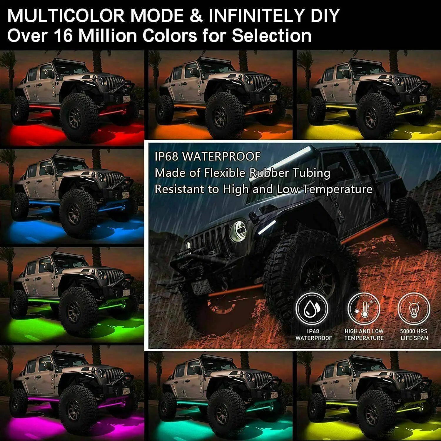 【IP68 Waterproof】: IP68 waterproof, dust-proof & rust-proof construction, driving through any heavy rain or harsh snow weather. We test the neon lights under the water for 3 hours consecutively and they all work well. Please pay attention to the waterproof of the controller, please do not expose it to the outside.