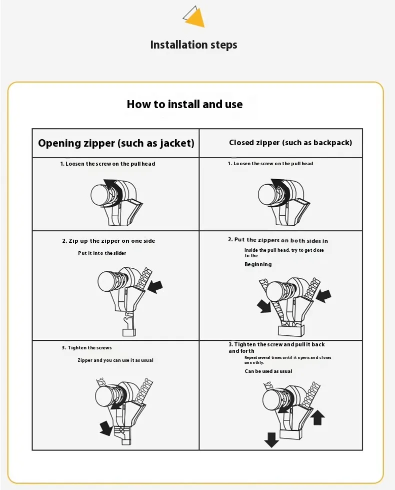 - 2. Easy and convenient installation:Designed to be easily replaced without professional tools. Just remove the old zipper, choose the right size, and screw it in, making sure to tighten the screws so that the zipper gear will close.