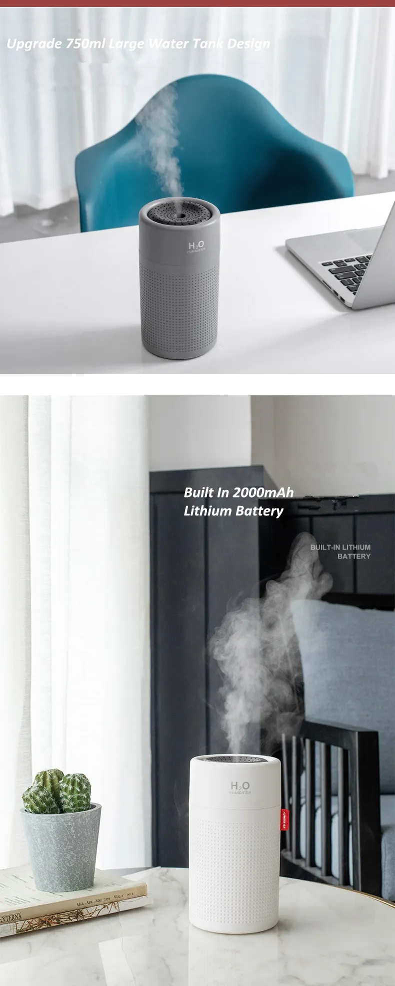 2. The humidifier battery can work for 5-7 hours, and the water tank can work for 18-28 hours