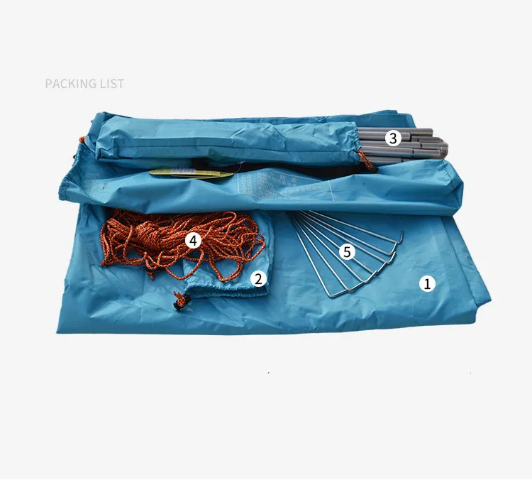 One canopy cloth, one hand bag, 2 canopy poles, 6 wind ropes, 8 ground nails