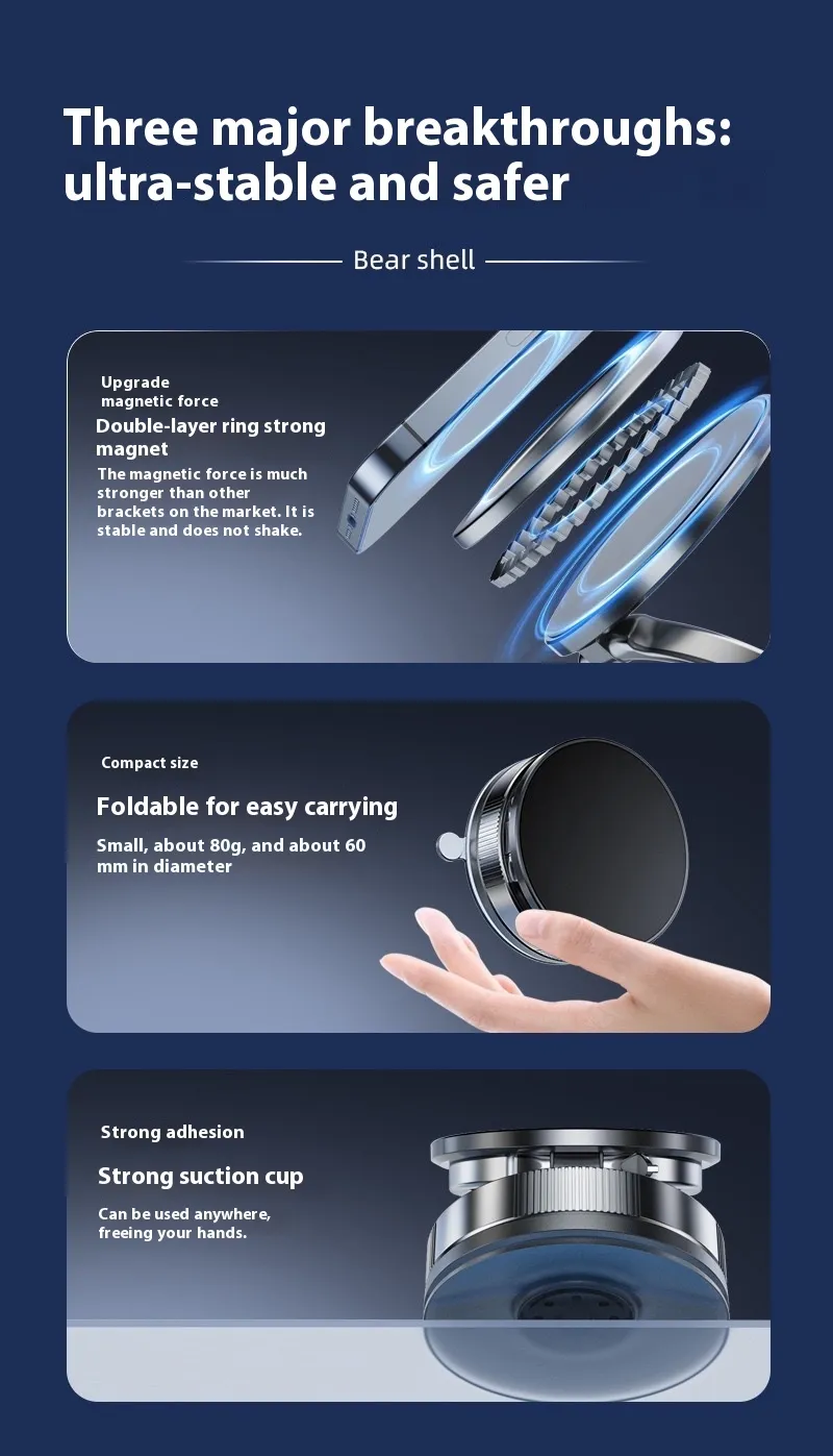 Crafted from premium materials, this magnetic holder is both durable and sleek. Its compact design does not obstruct your view and blends seamlessly with any car interior. Installation is quick and effortless, with strong adhesive suction ensuring it stays firmly attached to your dashboard or console.