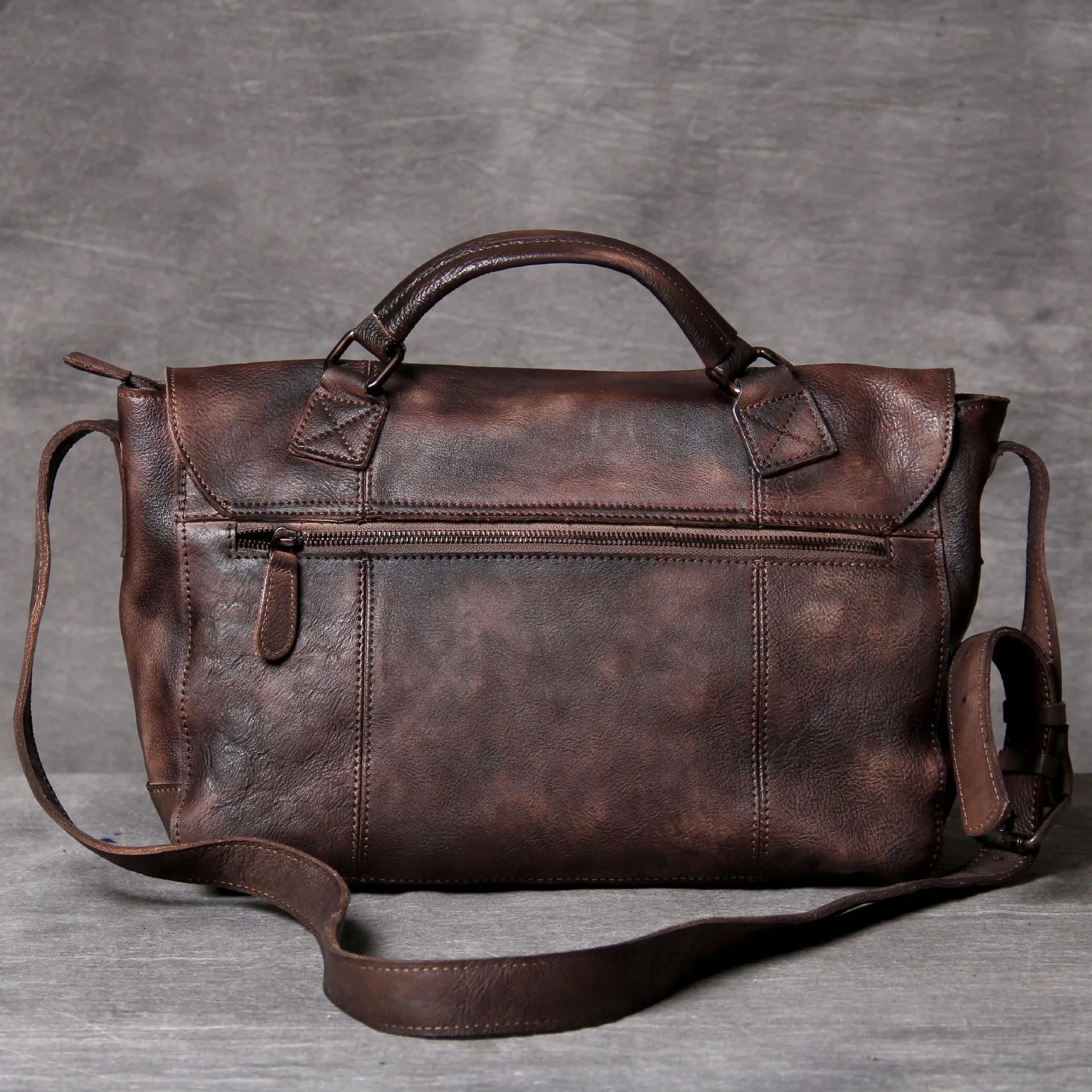 With its carefully distressed leather exterior, the bag carries a timeless and rugged vibe, making it the perfect accessory for those who love vintage style and classic design. The more you use it, the more unique it becomes.