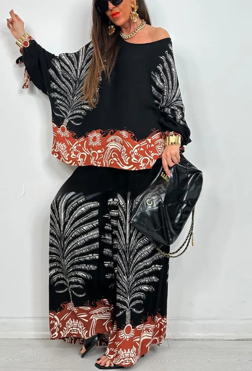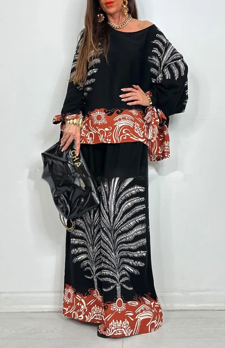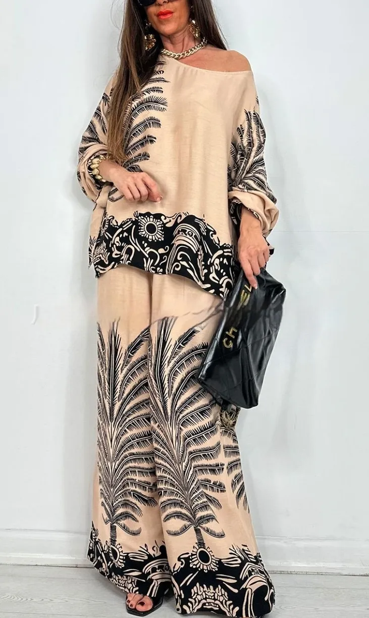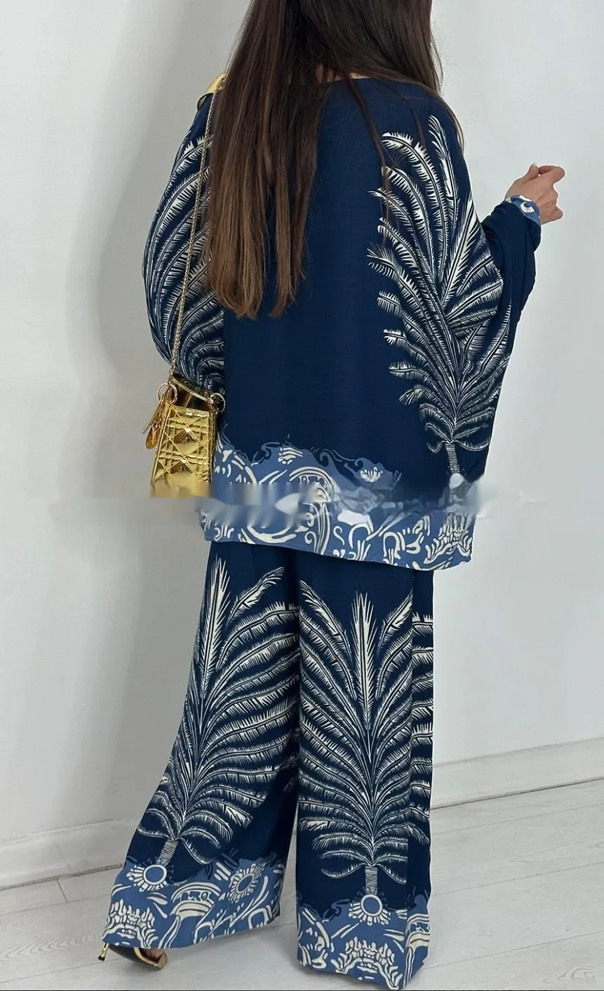 The coordinated floral design brings a touch of retro bohemian charm, while the wide-leg cut adds movement and grace to every step. Whether you dress it up with heels and accessories or keep it laid-back with flats and a tote, this outfit transitions seamlessly from day to night.