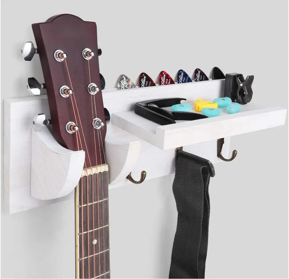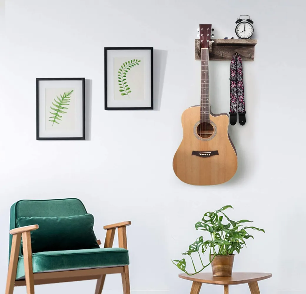 With its sturdy design, the wooden guitar wall rack hook is perfect for keeping your guitars off the floor and within easy reach, whether in your music studio, living room, or bedroom. This rack not only secures your instrument but also adds a decorative element to your space.