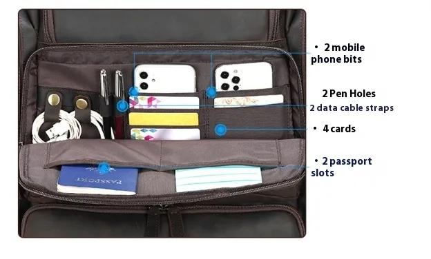interior includes multiple pockets for organizing smaller items like chargers, pens, and wallets, ensuring you can find what you need