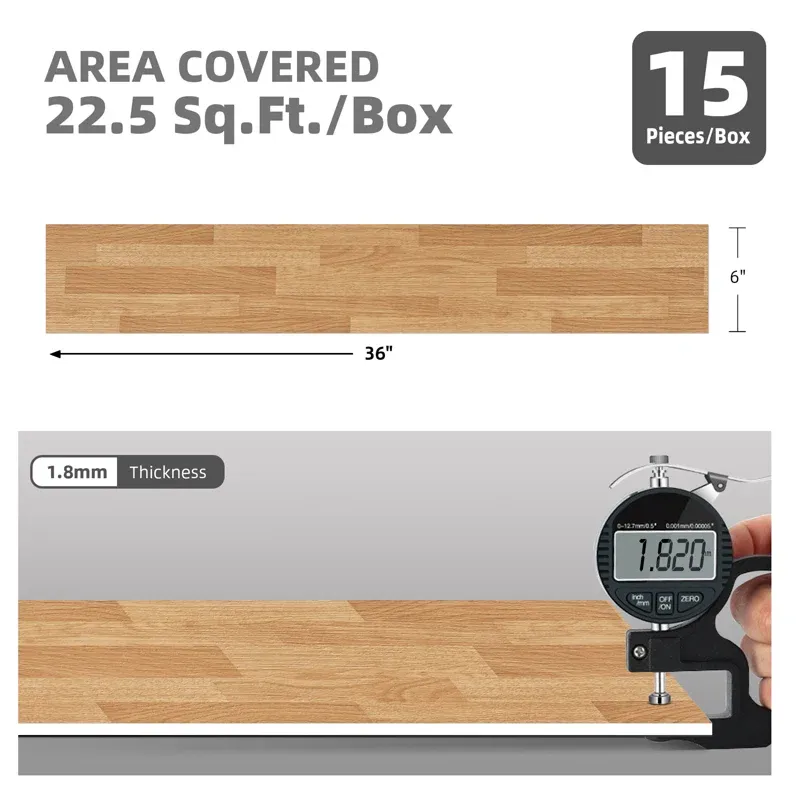 Package Details: Tile size: 6 inches wide x 36 inches long x 1.8 mm thick, 15 pieces per pack, covering 22.5 square feet.