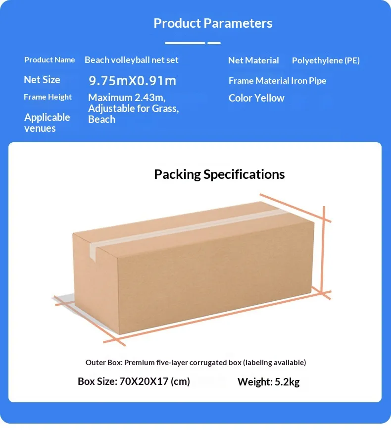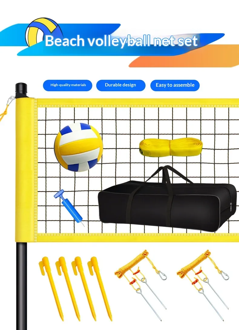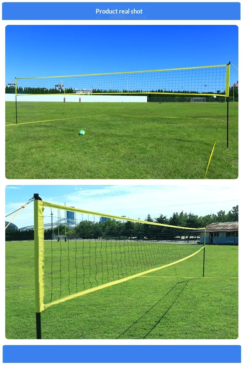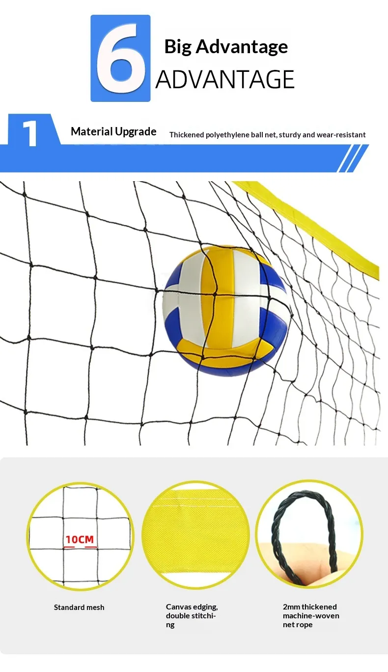 The core of the set is the high‑quality volleyball net itself. Made from durable, weather‑resistant materials such as heavy‑duty nylon or braided polyethylene, the net is designed to withstand outdoor conditions including UV exposure, wind, moisture, and repeated tensioning. The mesh size complies with standard volleyball play requirements, providing consistent performance whether for beach volleyball, backyard fun, school PE classes, or friendly neighbourhood competitions.