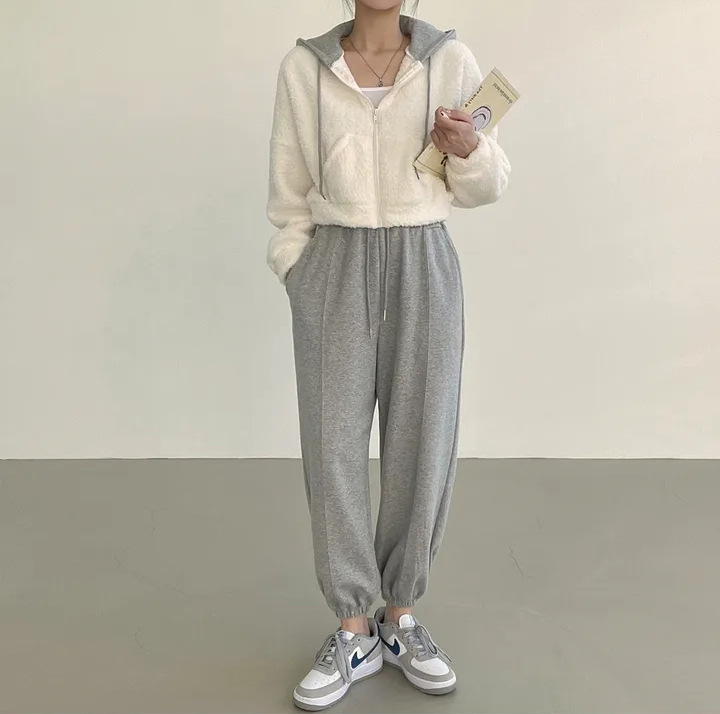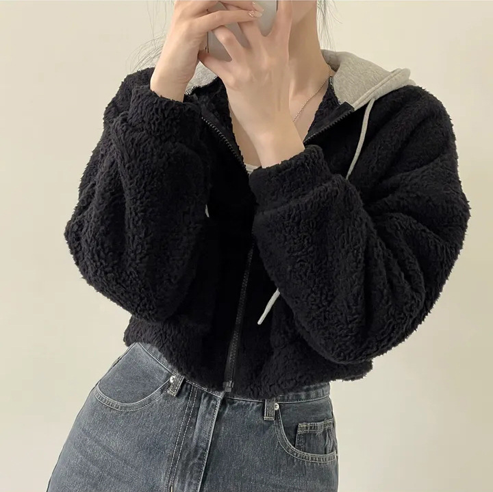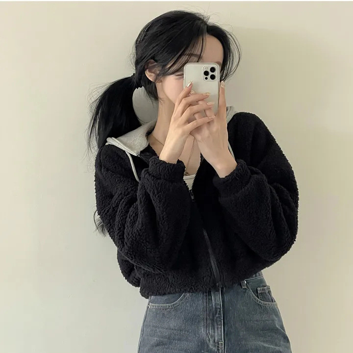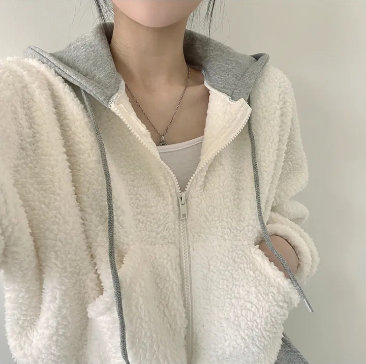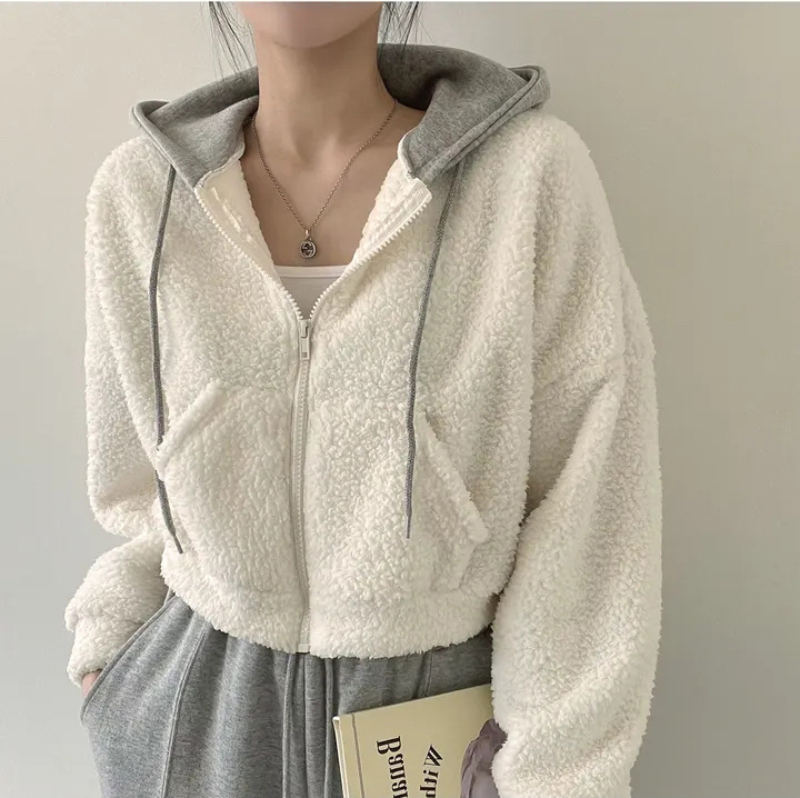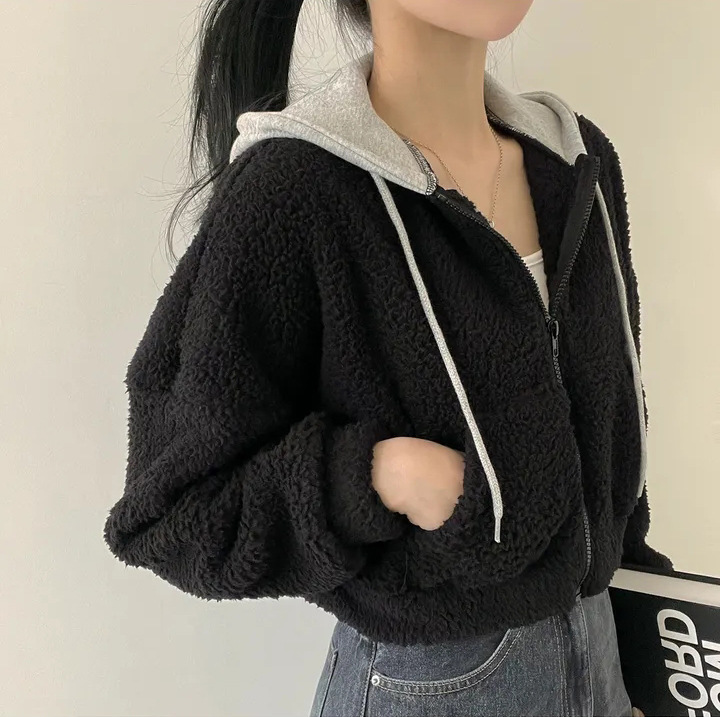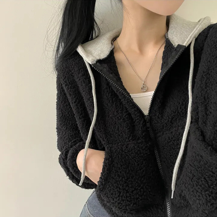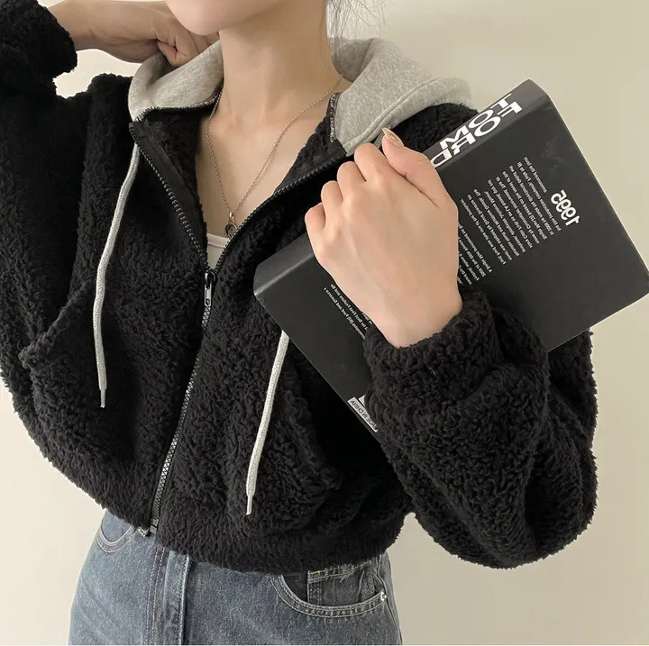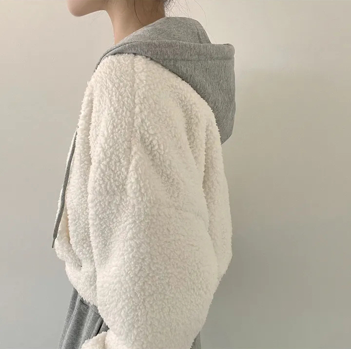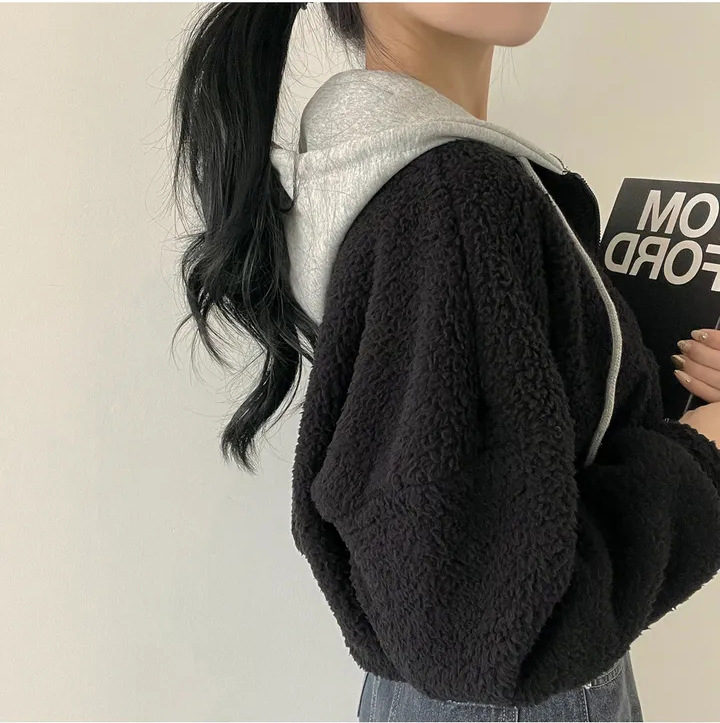 Warm Leisure Sports Loose Lamb Fur Hooded Pocket Small Plush Coat
