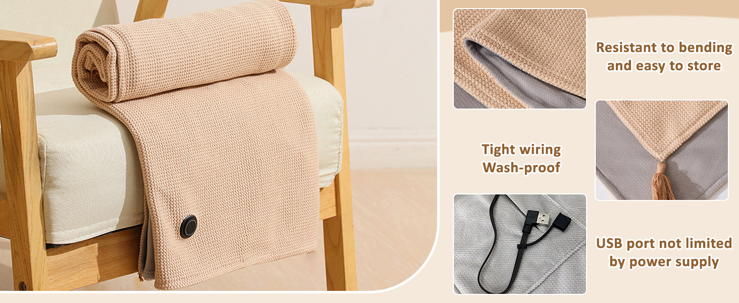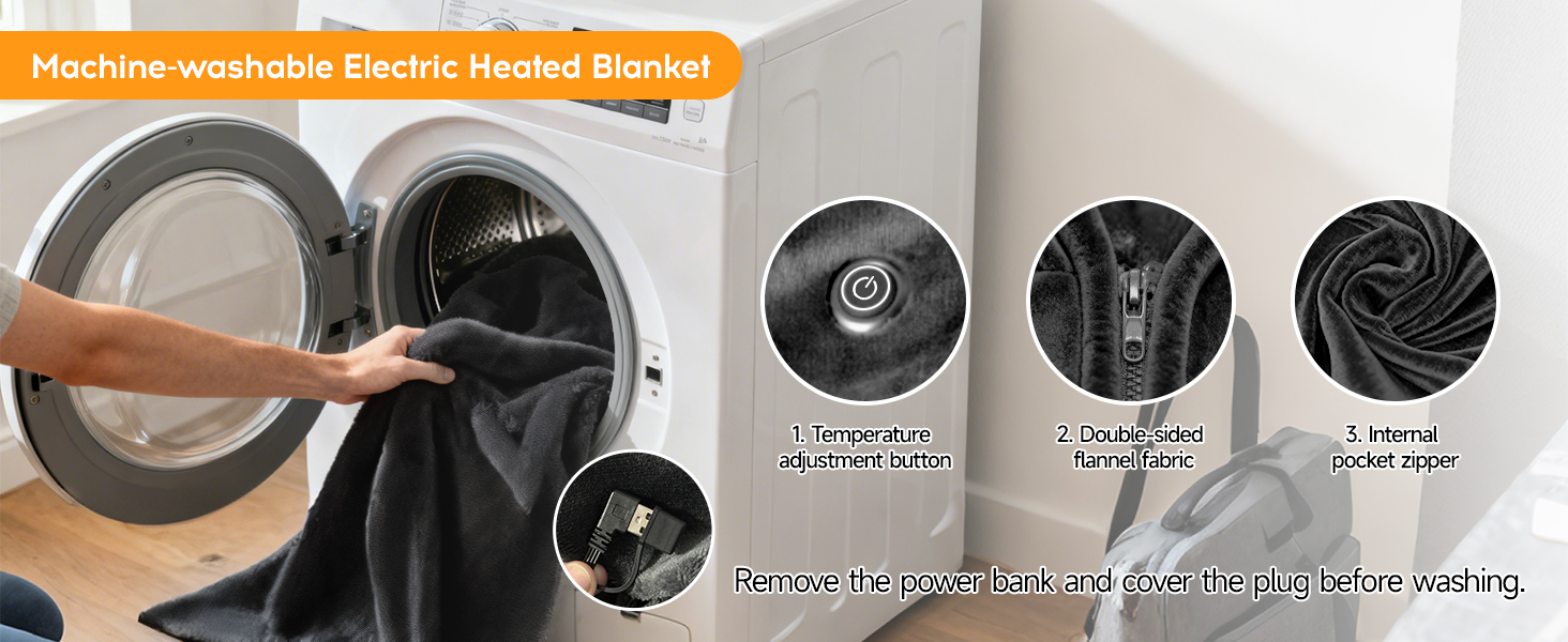 - 【Machine Washable】The switch and heater of our heated blanket throw are waterproof, you can wash it in the washing machine. (Please insert the USB cable into the pocket and wash the blanket in the laundry bag)