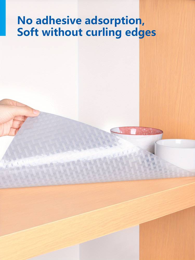 The liner has a non-slip textured surface, helping items stay in place and preventing bottles, jars, and containers from sliding around. It also protects shelves from scratches, stains, moisture, and crumbs, making your daily cleaning quicker and easier.