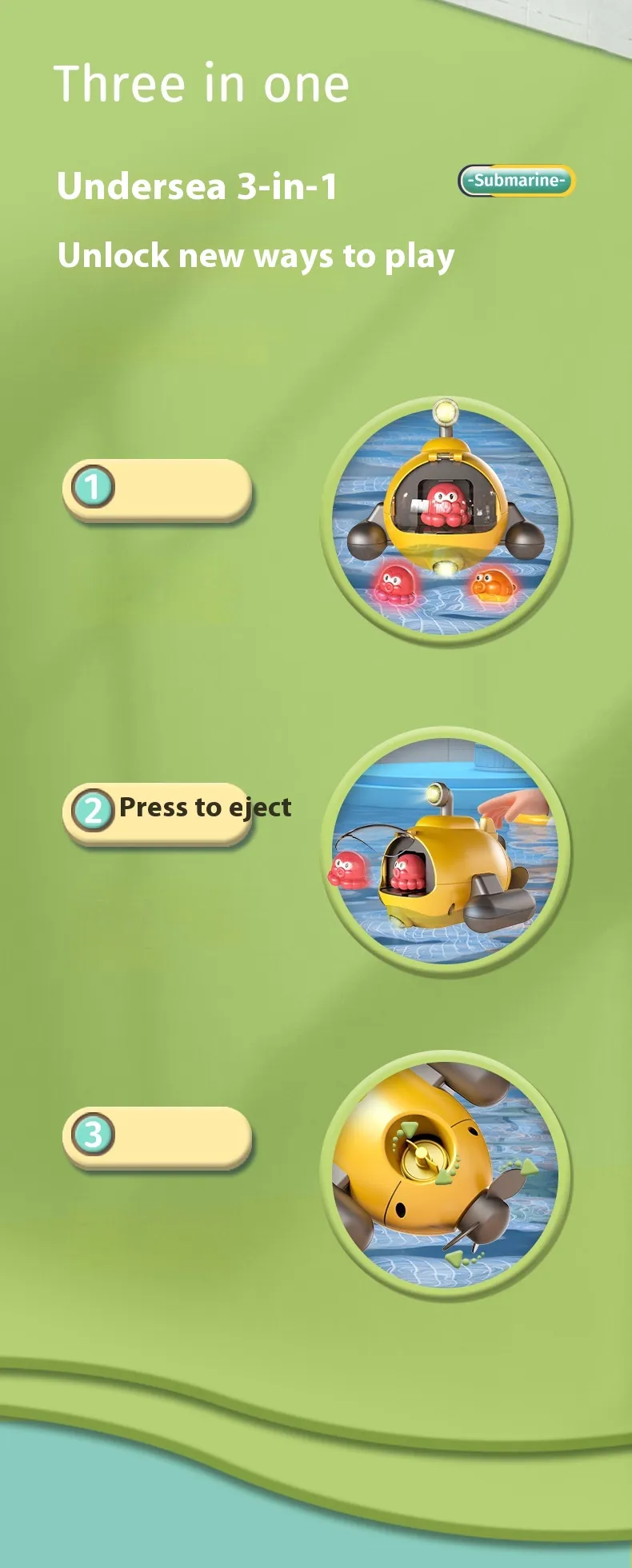 Crafted from non-toxic, durable materials, the submarine is safe for young children and built to withstand frequent use in water. The smooth edges and lightweight design make it easy for little hands to handle, enhancing hand-eye coordination and fine motor skills. The interactive catapult action encourages active play, helping kids develop their coordination while having fun.