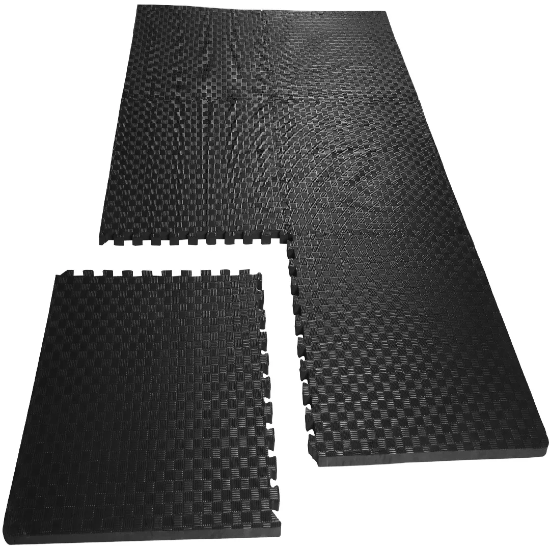 FITNESS FLOORING: Durable, non-slip textured tiles protect the floor while creating a comfortable workout space.