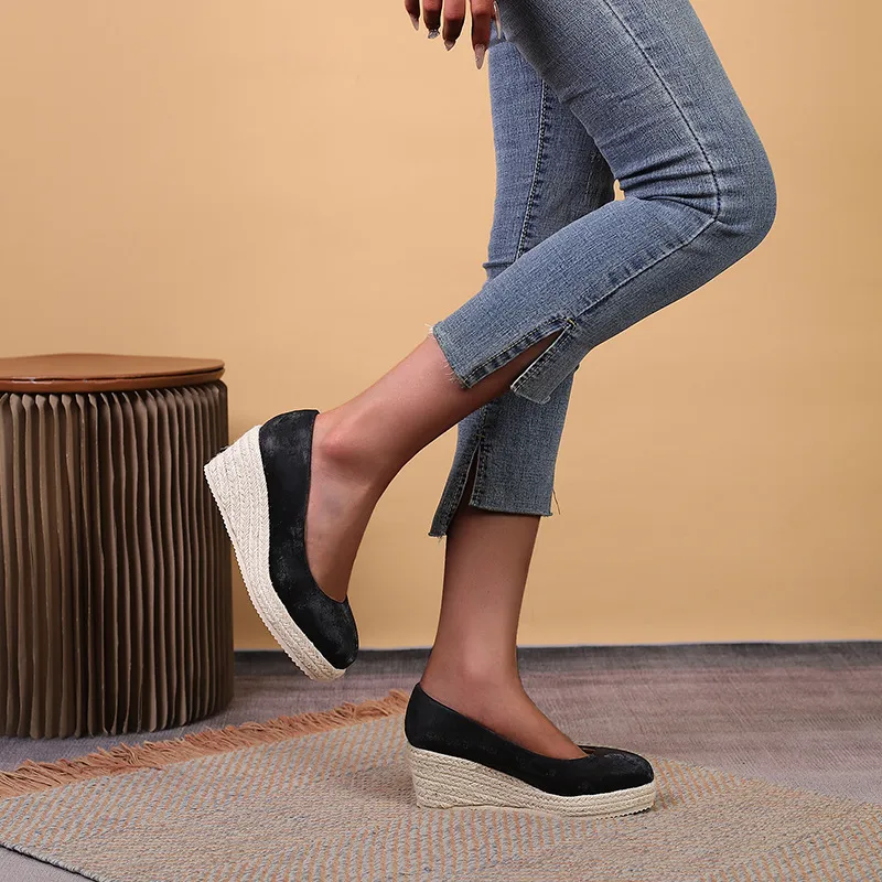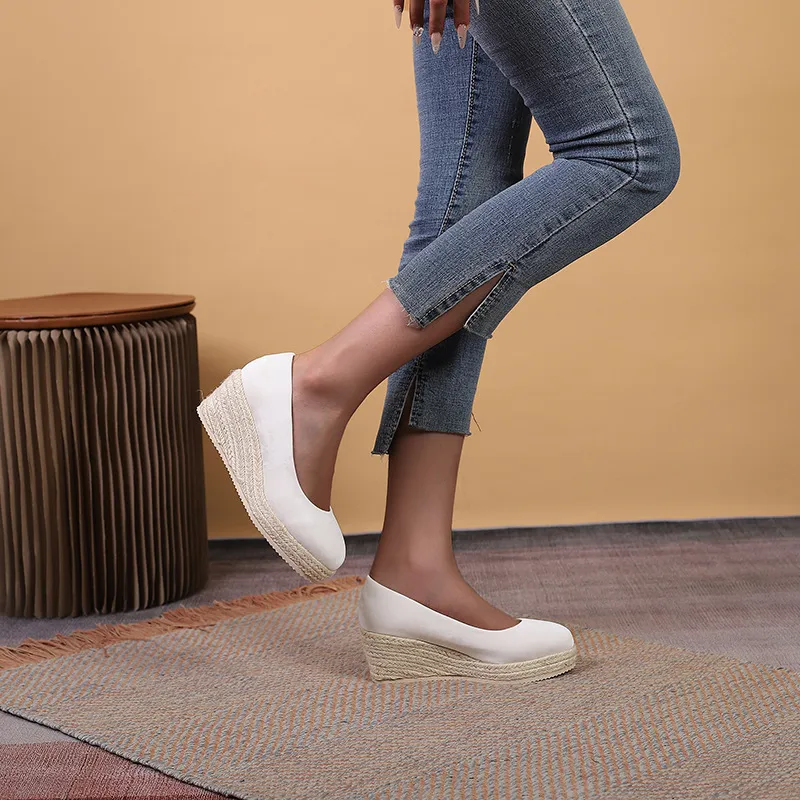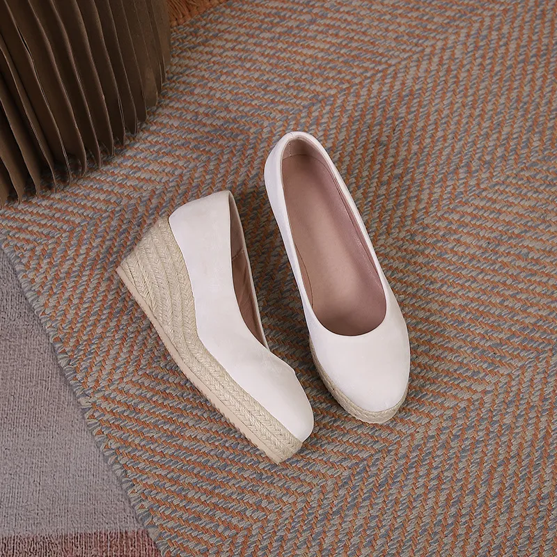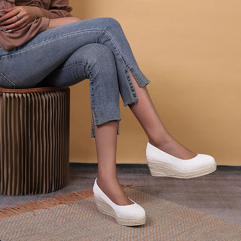 Step into sophistication and comfort with the Wedge Thick Bottom Shallow Mouth Comfortable Rope Bottom High Heel Pumps. These pumps combine the elegance of high heels with the stability and support of a wedge sole, making them perfect for women who want to look chic without compromising on comfort.