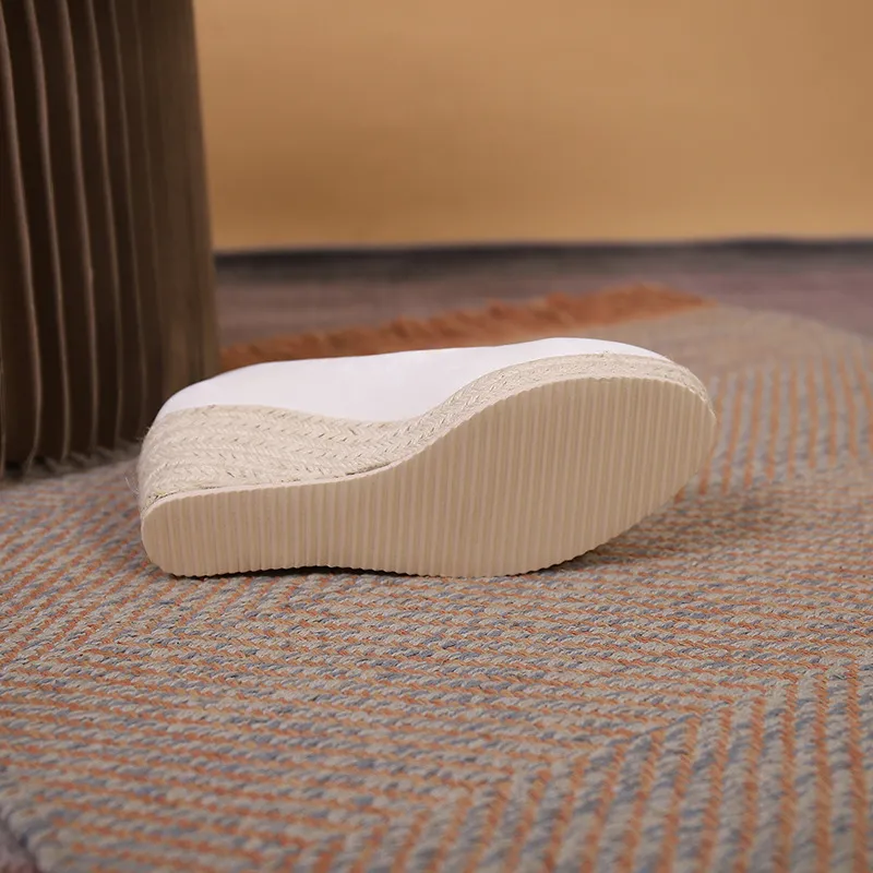 Featuring a shallow mouth design, these shoes offer a flattering fit that elegantly exposes the top of your foot while providing enough coverage for secure wear. The thick wedge sole ensures balanced weight distribution, reducing foot fatigue even after hours of use. The unique rope-textured bottom adds a trendy, natural aesthetic, inspired by classic espadrille styles, while providing excellent traction on various surfaces.