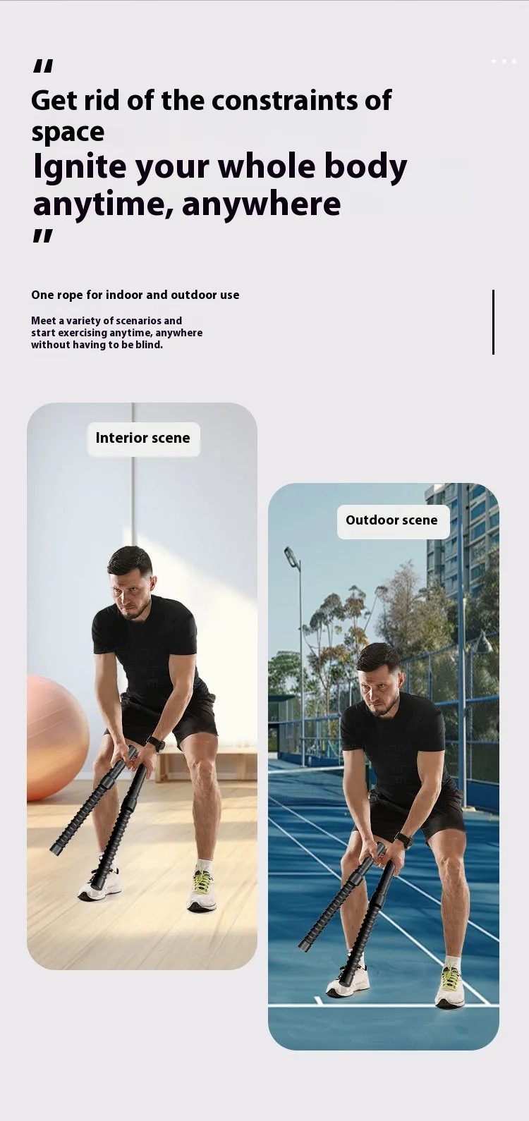 Simulates battle rope workouts without traditional ropes, eliminating tangles and expanding workout locations.