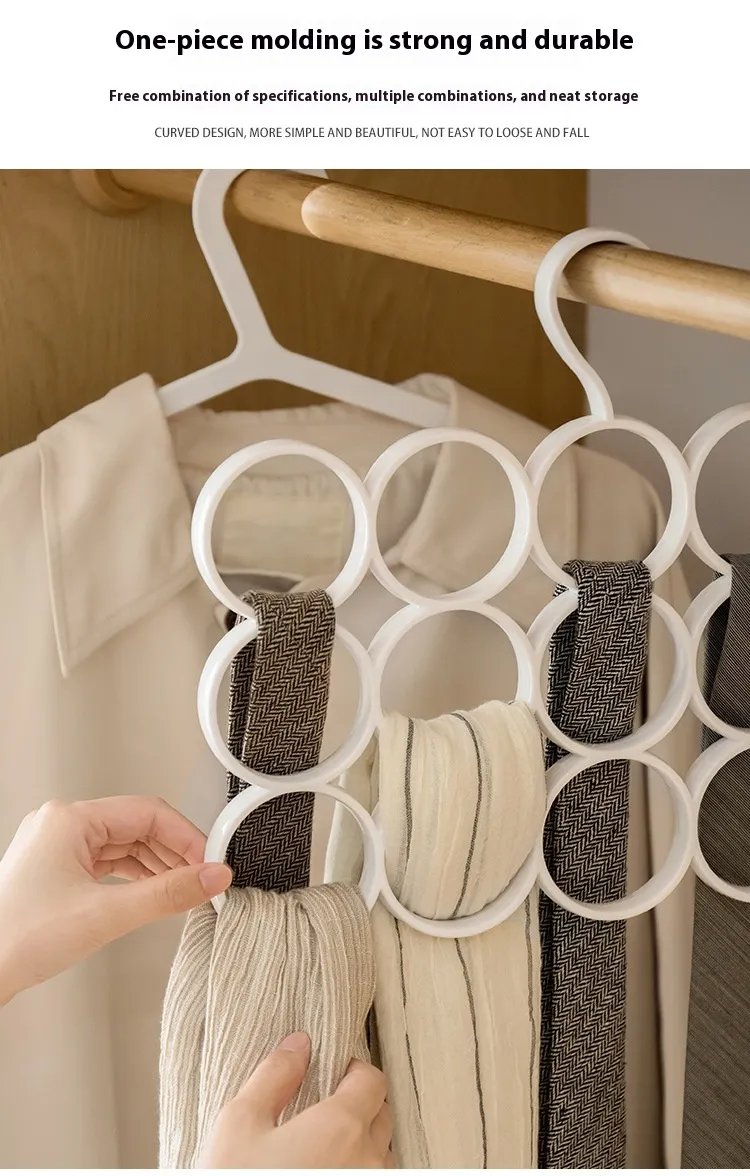 The White Clothes Hanger With Hoops Creative Plastic 15-ring Scarf Rack makes it easy to store and retrieve your scarves. Simply slide your scarves onto the hoops, and they’ll be neatly arranged for easy access whenever you need them. Whether you're dressing for work, a special event, or just a casual outing, this rack makes finding the perfect scarf quick and easy, helping you save time and stay organized.