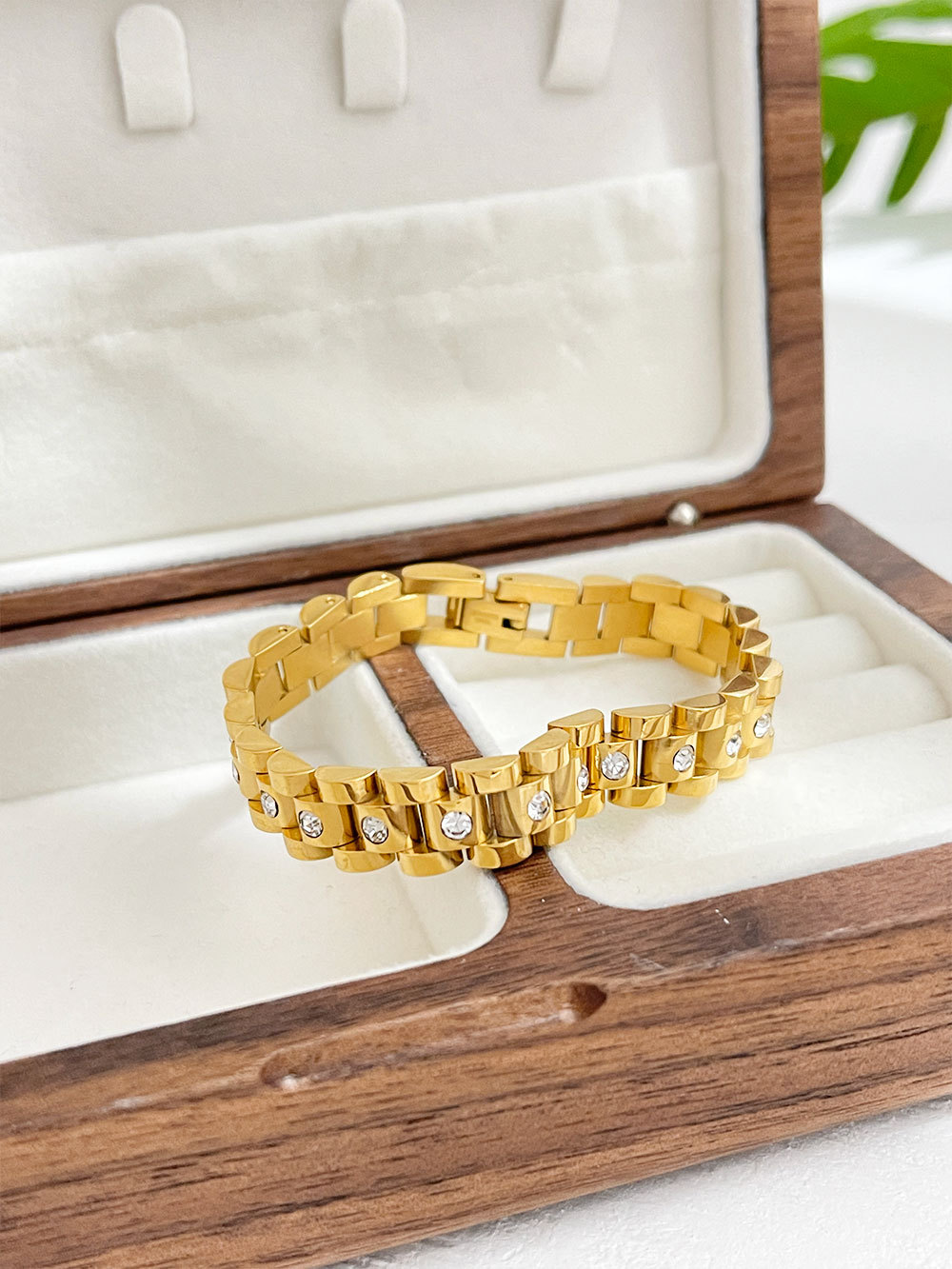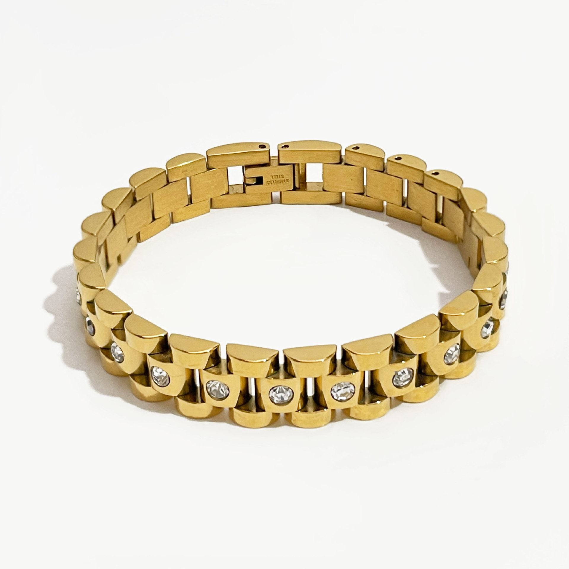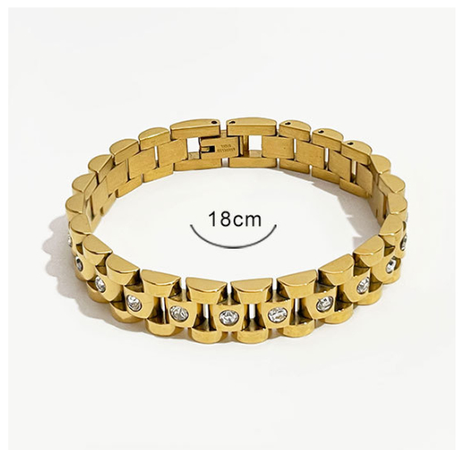 Elevate your style with the White Diamond Titanium Steel Watch Chain, an elegant bracelet featuring an 18K gold non-fading finish. This