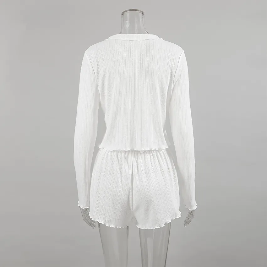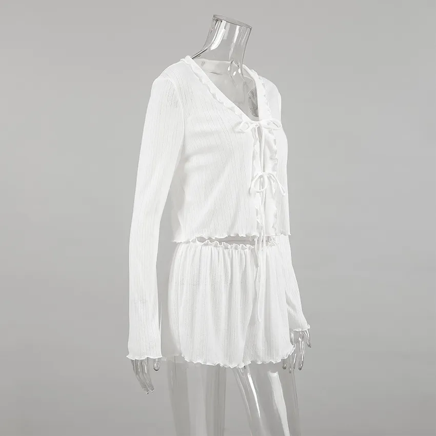 White Hollow-out Jacquard Pajamas Suit Cardigan Long Sleeve Shorts Homewear