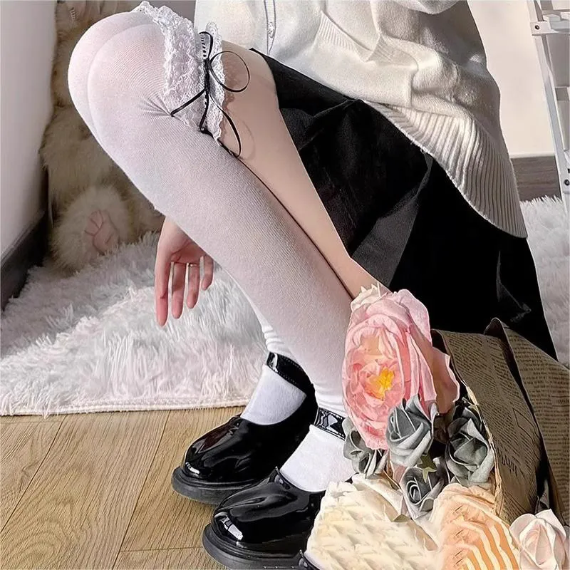 White stockings are available in various styles, from classic plain stockings to those with lace trims, floral patterns, or other decorative