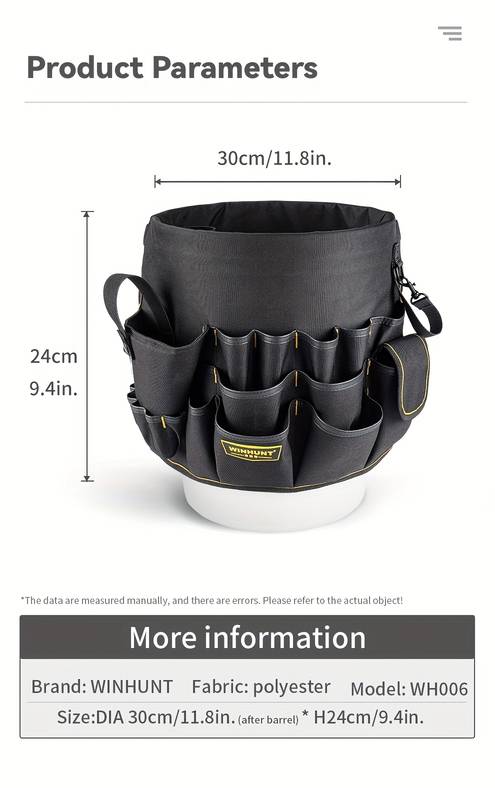 The WINHUNT Heavy-Duty Bucket Tool Organizer is an essential addition to any toolkit. With durable polyester construction, multiple compartments, and ergonomic design, this tool bag provides the ultimate solution for organizing and transporting your tools. Perfect for handymen, construction workers, and DIY enthusiasts, this organizer is versatile, compact, and built to last, ensuring your tools are always ready for the job.