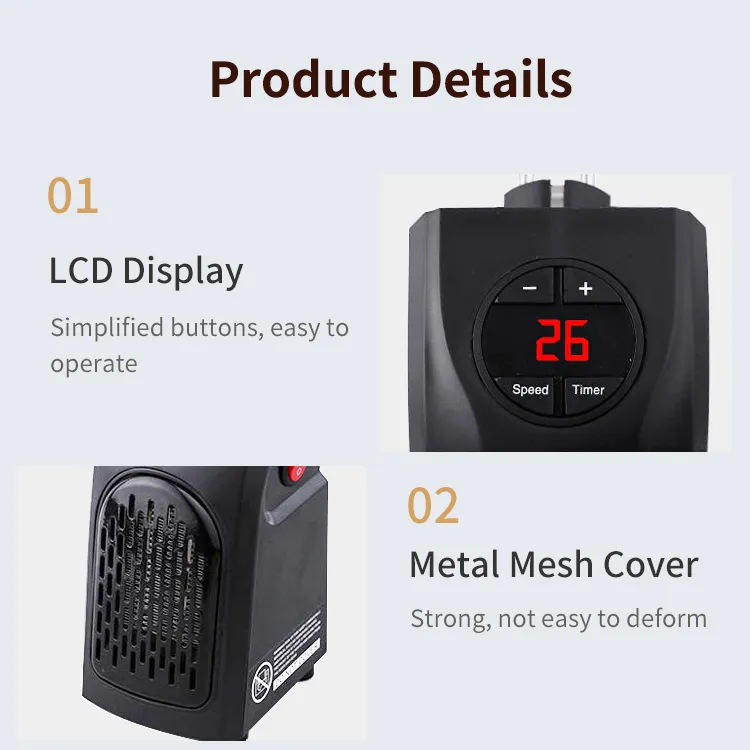 1. The fan heater is built with PTC ceramic heating element, using electric heating, raising the temperature in the room quickly and safely