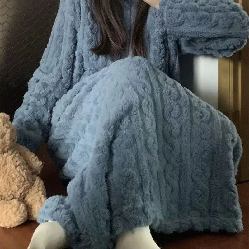 Winter Coral Fleece Sleepwear Women's Nightgown Long Night Dress Pajamas With Pockets Thickened Jacquard Dress Warm Home Clothes