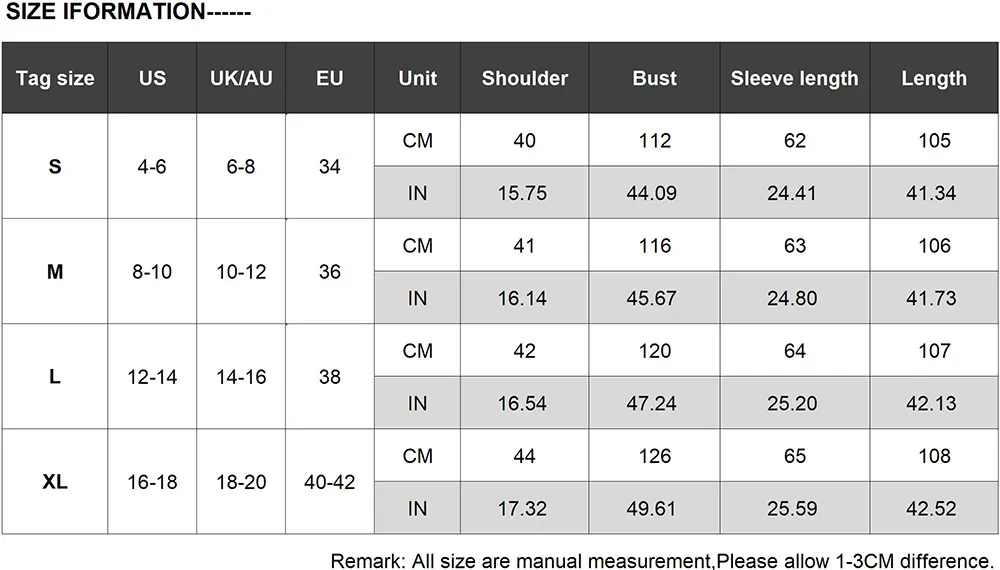 2-3cm differences due to manual measurement. 2. Please check the size chart carefully before you buy the item, if you don't know how to