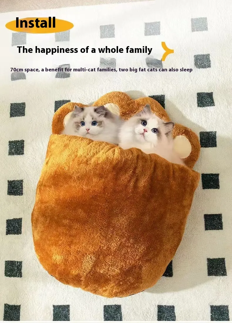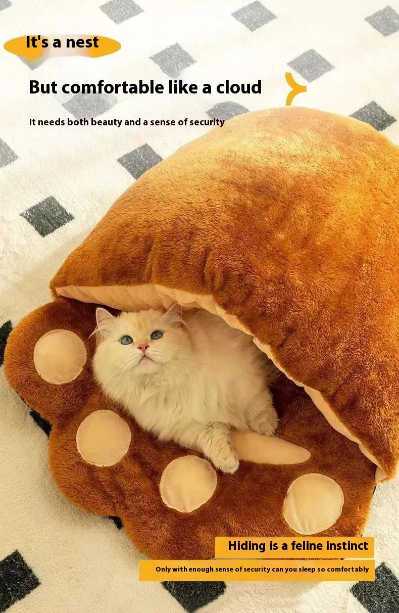 Winter Warm Cute Bear Paw Cat Bed Thickened House Semi-closed Cat Nest Large Space Washed Sleeping Bag Dog Pet Bed Pets Products