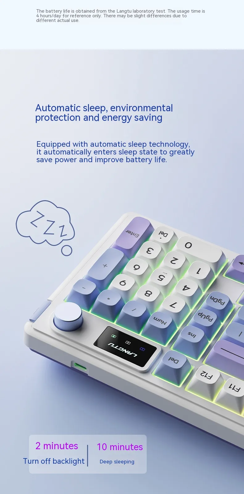 With its efficient power management system, this keyboard boasts a long battery life, allowing you to work or play for hours on a single charge. It features an auto-sleep function to conserve energy when not in use, making it both environmentally friendly and convenient.