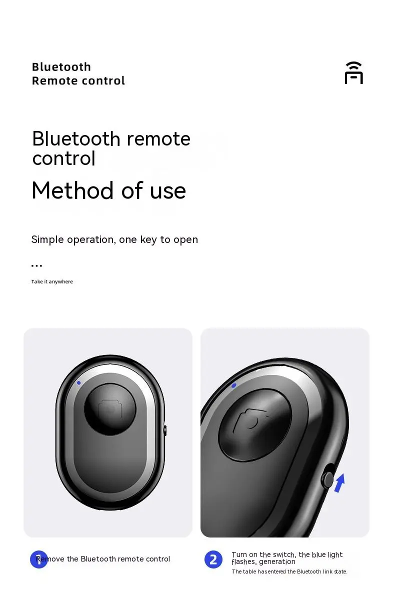 The Wireless Bluetooth Remote Self-Timer Photo Remote Control is the ultimate accessory for capturing professional-quality photos and videos without the hassle of needing someone else to press the shutter button. This compact and easy-to-use remote control connects seamlessly via Bluetooth to your smartphone or camera, allowing you to take selfies, group photos, and action shots with just a click of a button. Ideal for solo travelers, vloggers, photographers, and anyone who enjoys capturing moments on their own, this remote makes it easier than ever to capture stunning, hands-free shots.