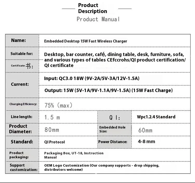 Built with waterproof materials and a sealed design, this embedded wireless charger is safe for everyday use—even in kitchens, cafes, or outdoor settings. Its durable build ensures long-lasting performance while protecting against spills, moisture, and wear.