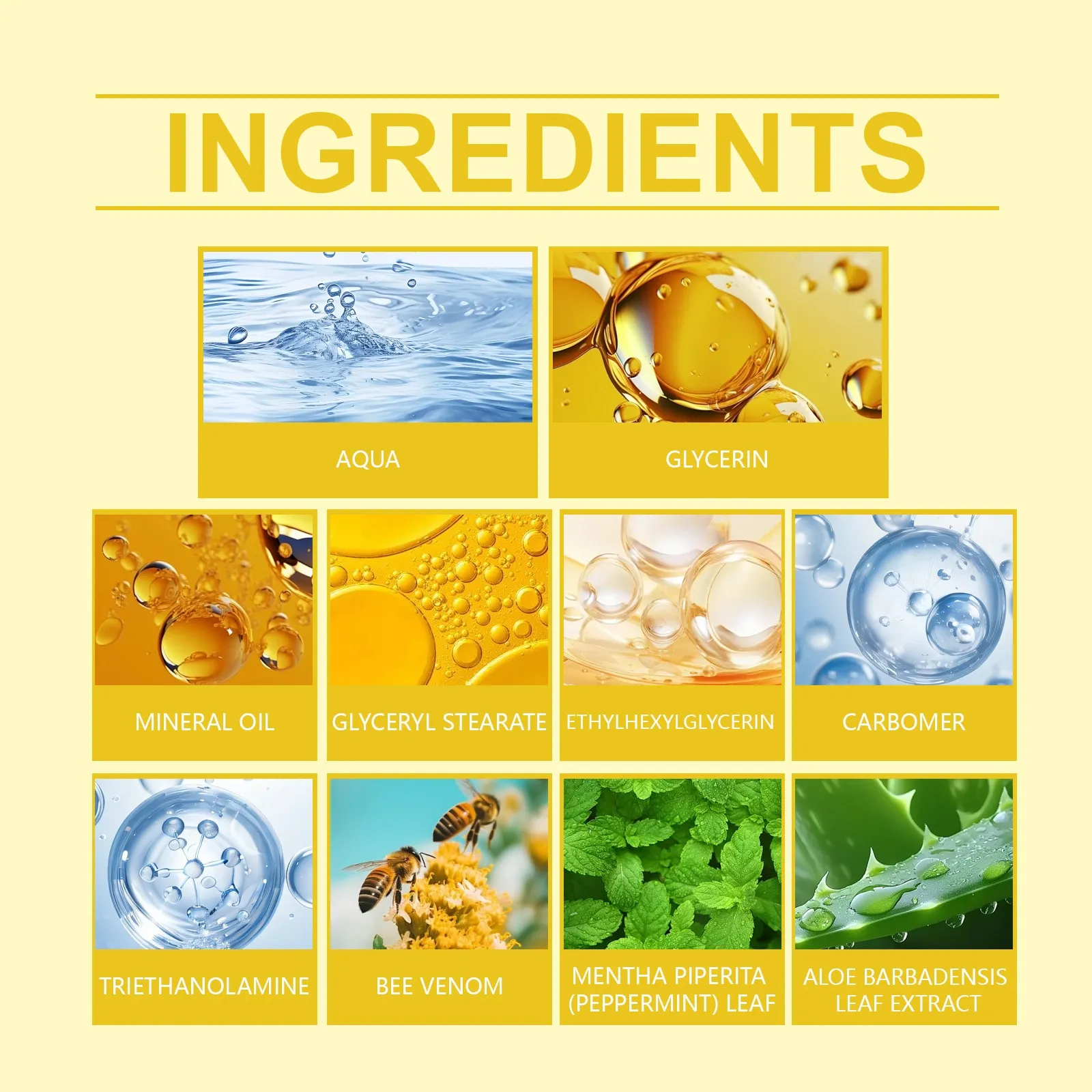 Ingredients: Water, glycerin, mineral oil, Glyceryl stearate, ethylhexyl glycerol, carbomer, triethanolamine, bee venom, mint leaf, aloe