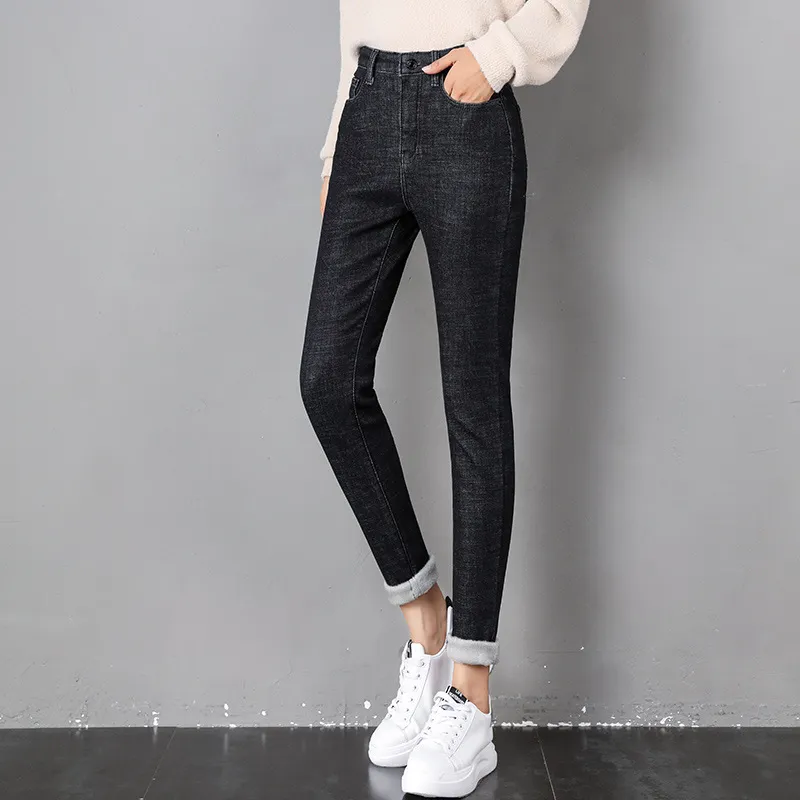 Women Thermal Jeans Winter Snow Warm Plush Stretch Jeans Lady Skinny Thicken Fleece Denim Long Pants Retro Blue Pencil Trousers