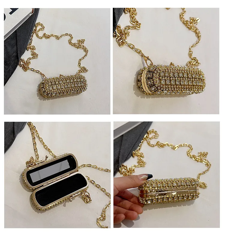 - A shimmering exterior fully embellished with high-quality rhinestones that catch the light beautifully.