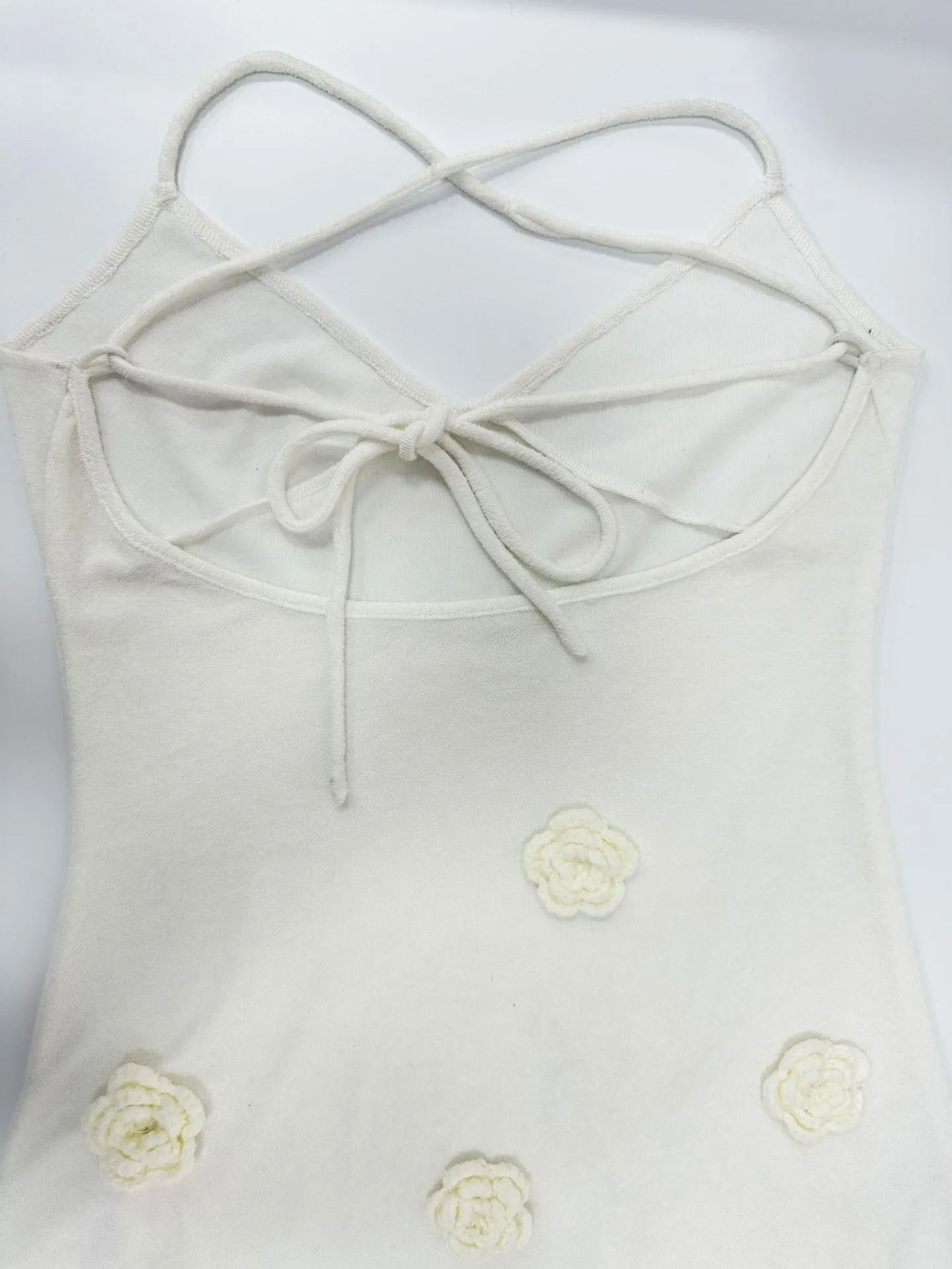 The standout feature of this dress is its three-dimensional flower design, which adds a touch of femininity and elegance. The floral elements are intricately knitted, offering a texture that's both visually appealing and unique. The dress is backless, with a lace-up design that provides an adjustable fit, allowing you to customize the level of comfort and style. The braces skirt design adds a playful yet sophisticated element, making it suitable for various occasions.