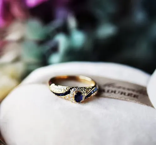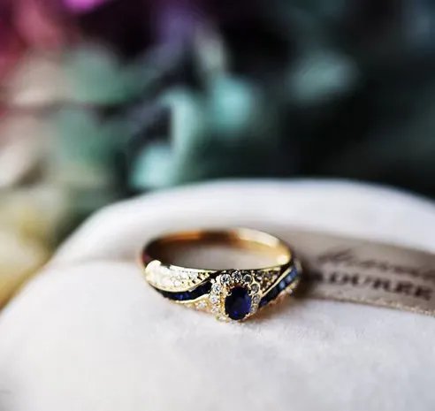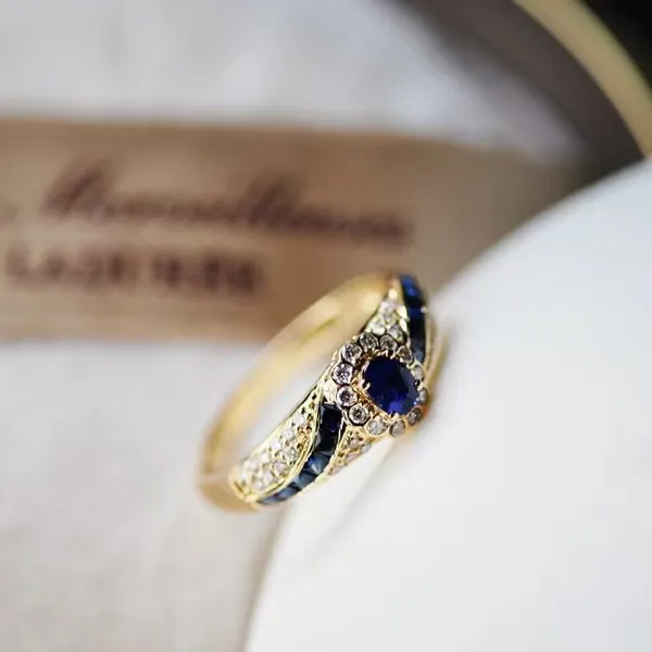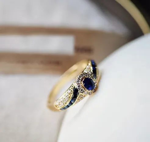 The ring showcases meticulously micro-inlaid sapphire and zircon stones, creating a sparkling, luxurious look that catches the light from every angle.