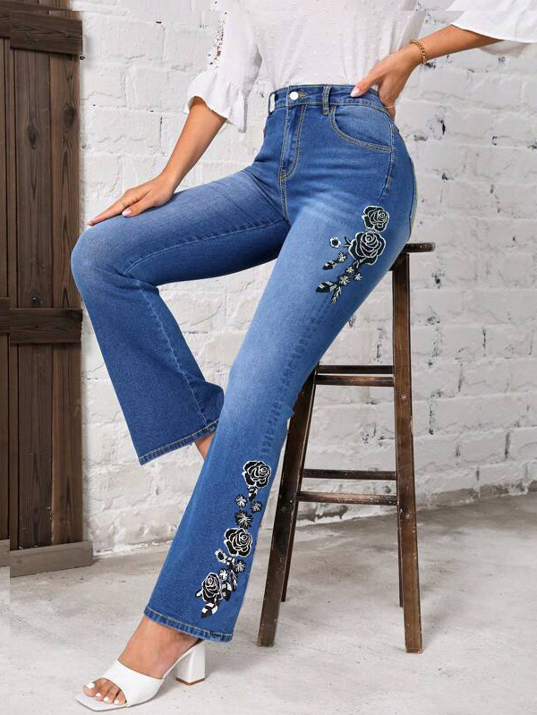 jeans are designed to enhance your wardrobe with a touch of bohemian elegance, thanks to their exquisite floral embroidery that cascades