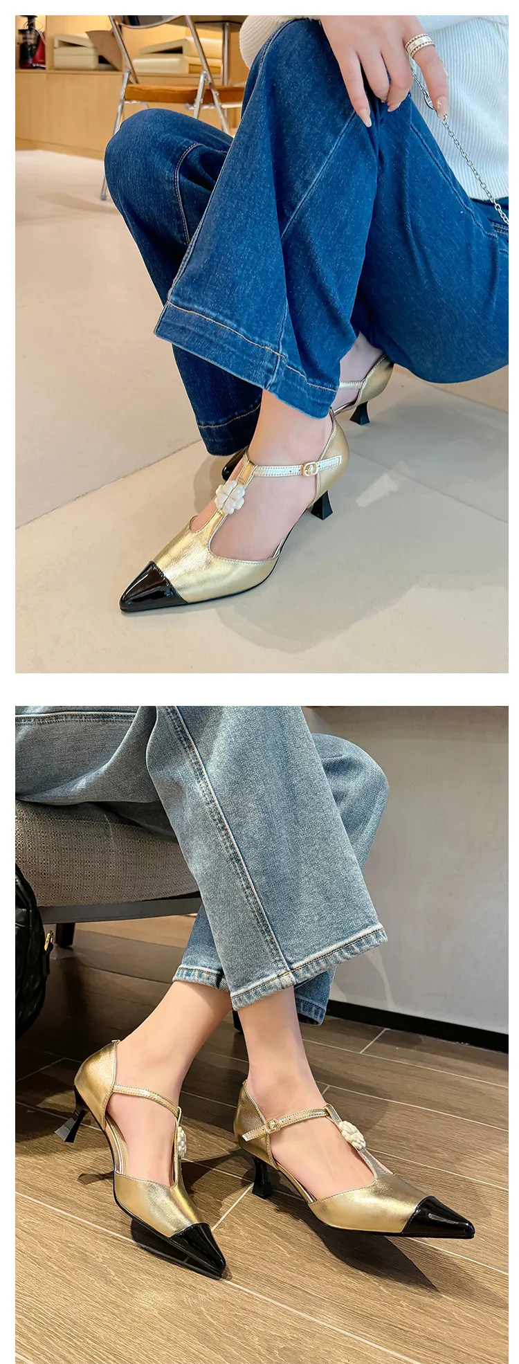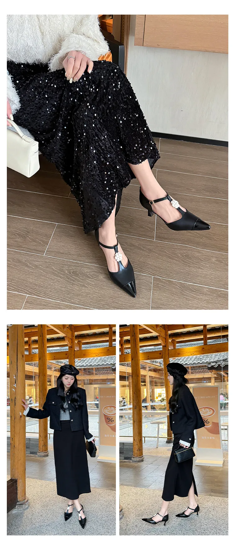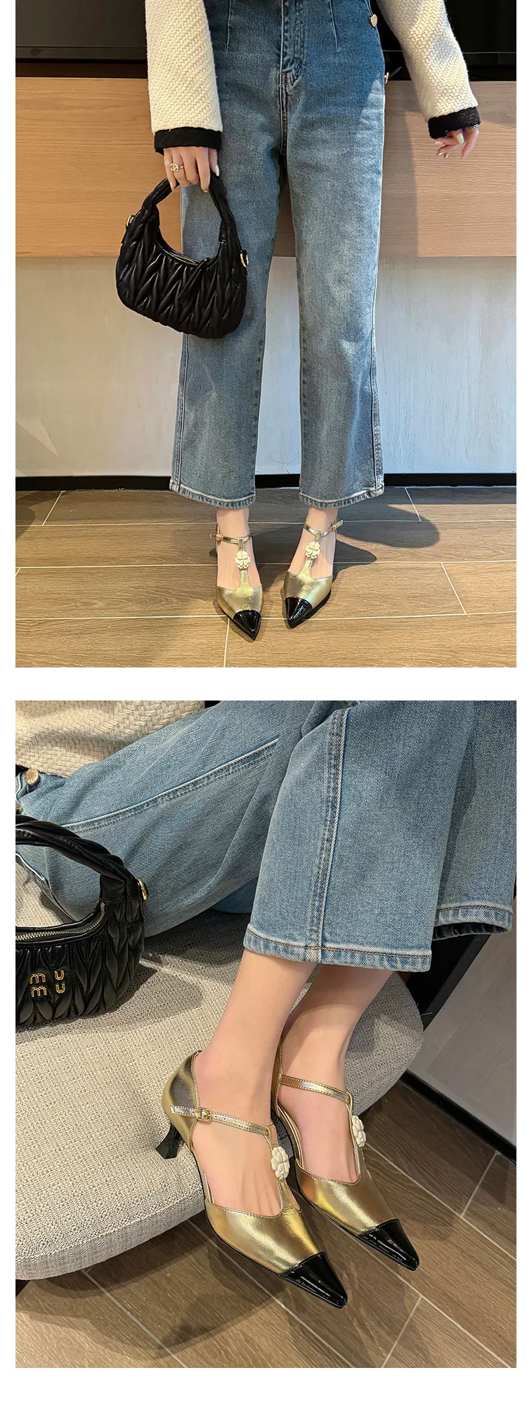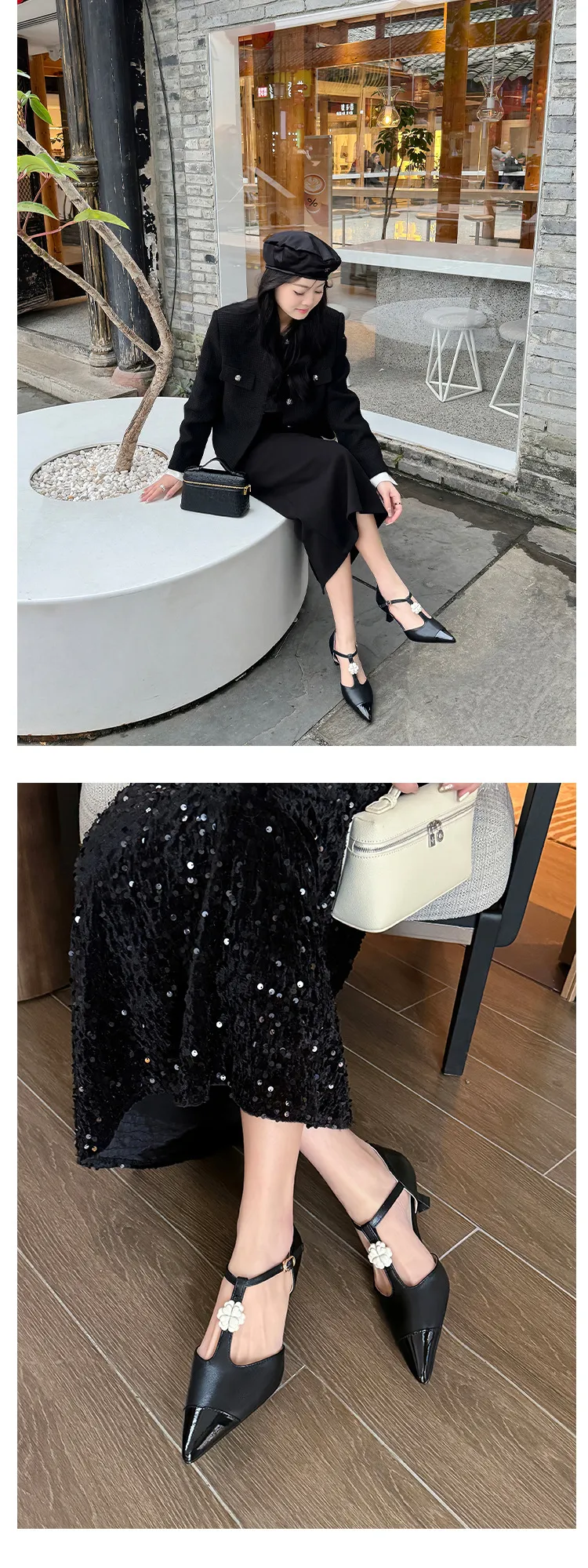 Crafted with precision, the pointed toe design elongates the leg, giving a sleek silhouette that enhances any outfit. The shallow mouth cut adds a modern, minimalistic touch, while still holding the foot securely and comfortably. Adorning the upper is a delicate floral embellishment, which gives these heels a charming, romantic vibe — just the right blend of subtlety and statement.