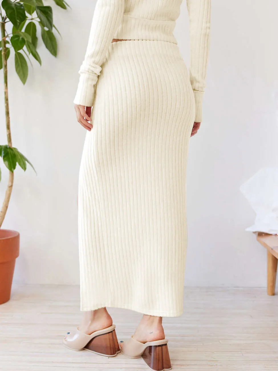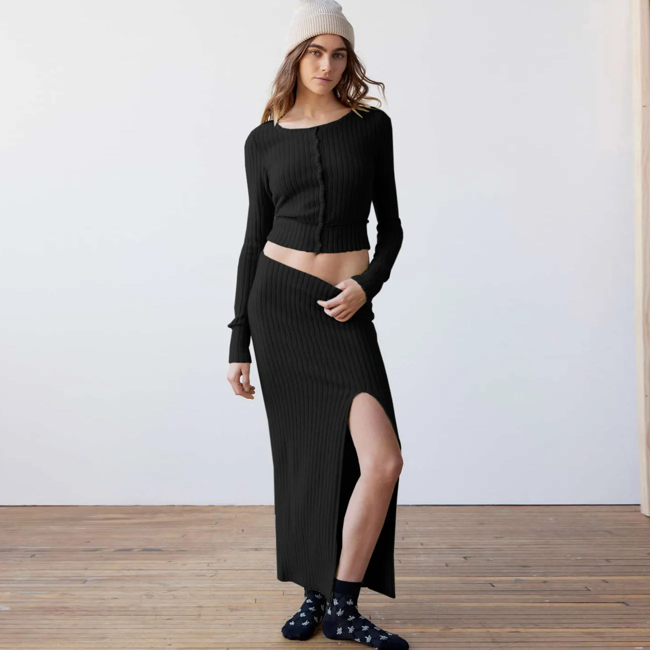 - Features: A Crew Neck Long Sleeve Crop Top and High waisted Midi Skirt with Side Slit, featuring a solid color and high elasticity for an added touch of beauty and style.