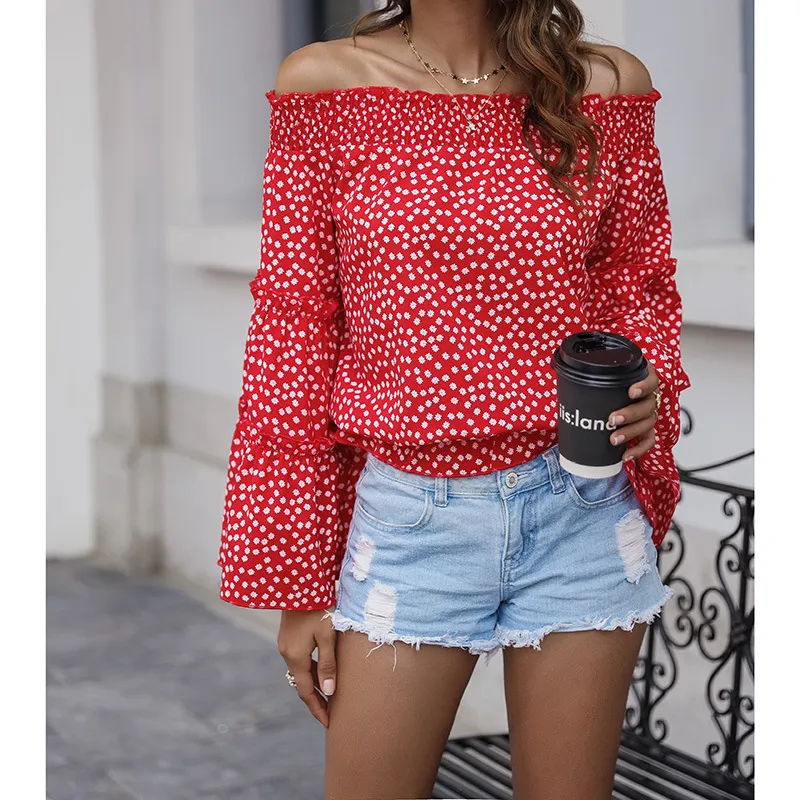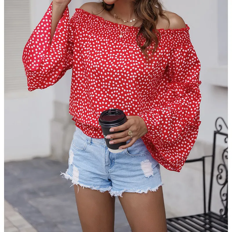Women's One-Word Collar Off-Shoulder Small Shirt With Flared Sleeves Long Sleeve